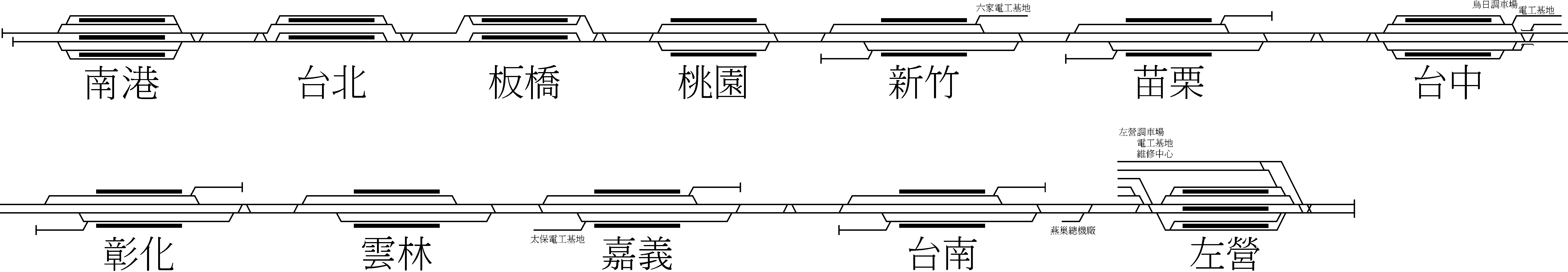2018년 7월 시간표에 따르면, 매주 989편의 열차가 운행되며 매일 05:50부터 24:00까지 운행된다.[64] 대부분의 남행 열차는 난강역에서 출발하며, 대부분의 북행 열차는 쭤잉에서 출발한다. 그러나 몇몇 열차는 난강과 타이중 또는 타이중과 쭤잉 사이에서만 운행된다. 남행 열차는 홀수, 북행 열차는 짝수 열차 번호로 지정된다.[71]