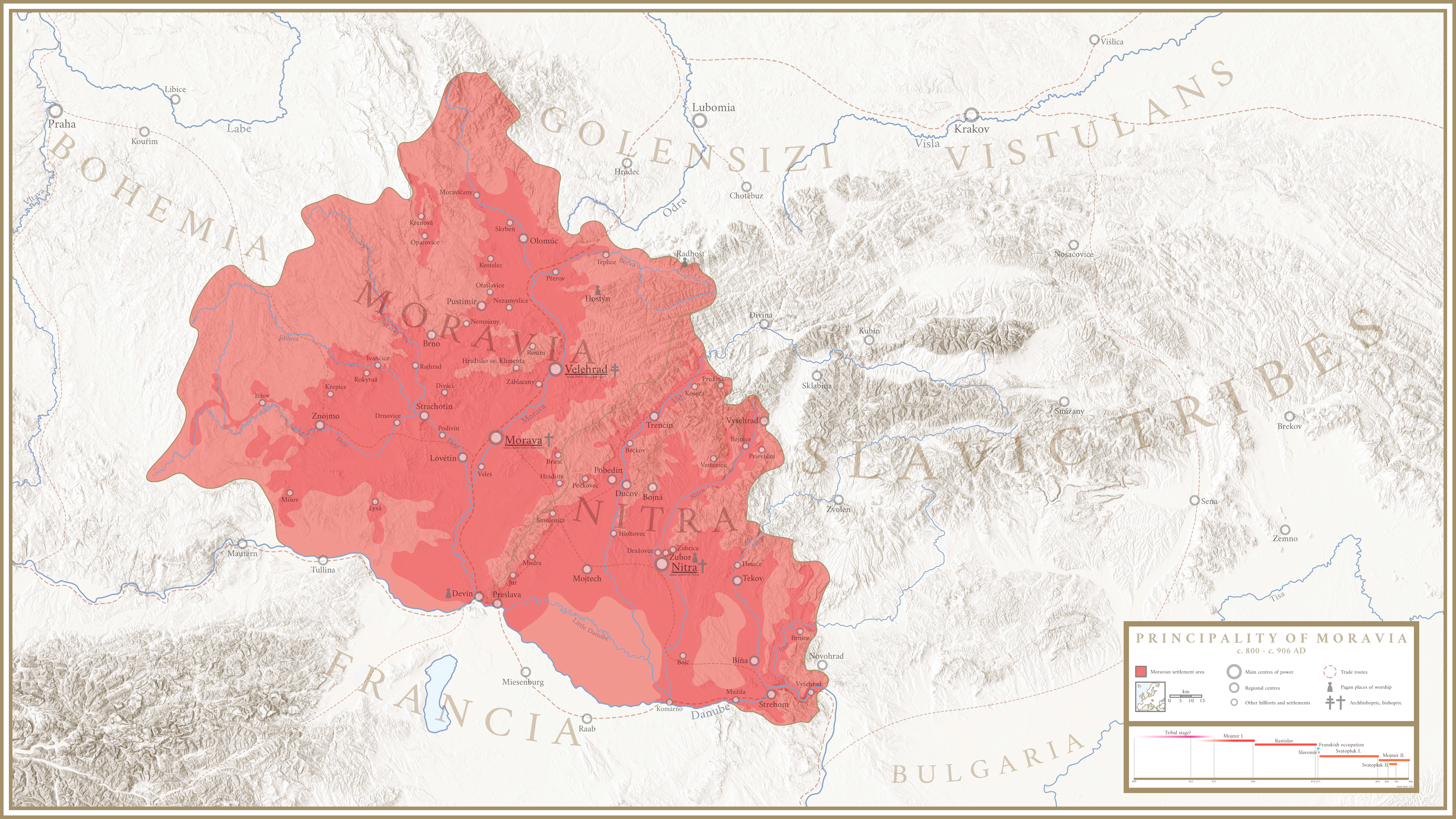 모이미르 1세의 뒤를 이은 라스티슬라프는 처음에는 동프랑크 왕국의 루트비히 2세의 종주권을 인정했다. 그러나 그는 모라비아 내에서 자신의 지위를 공고히 하고 왕국의 국경을 확장해 나갔다.[77] 예를 들어, 현재 슬로바키아 동부의 슬란스케 언덕 지역을 합병했다.[77]