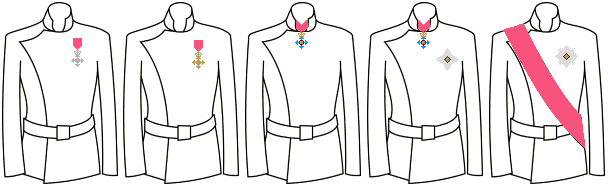 대십자기사와 대십자여기사는 문장 지지자를 받을 자격이 있다. 또한, 그들은 문장 주위에 장식띠(모토가 새겨진 원)와 목걸이를 그릴 수 있다. 기사사령관과 여기사사령관, 사령관은 문장 주위에 장식띠를 표시할 수 있지만, 목걸이는 표시할 수 없다. 배지는 목걸이 또는 장식띠에 매달려 표시된다.[33]