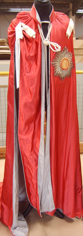 망토는 장미 분홍색 새틴으로 만들어지고 진주 회색 실크로 안감을 댄 망토 모양의 의복이다(1937년 이전에는 자주색 새틴이었다). 왼쪽에는 훈장의 별이 새겨져 있다.