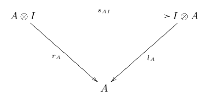 위 그림에서 ''a'', ''l'', ''r''은 각각 결합 동형 사상, 왼쪽 단위 동형 사상, 오른쪽 단위 동형 사상이다.