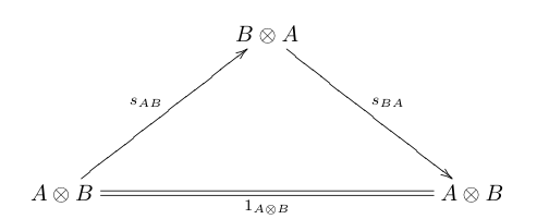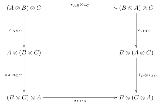 대칭 모노이드 범주는 모든 대상 ''A'', ''B''에 대해 라는 동형 사상, 즉 ''swap map''(교환 사상)[1]이 존재하는 모노이드 범주(''C'', ⊗, ''I'')이다. ''swap map''은 ''A''와 ''B'' 모두에서 자연 변환이며, 다음의 그림들이 가환한다.