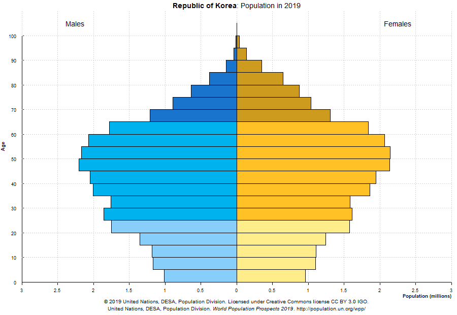 1990년대에는 젊은 층이 많고 노년층이 적은 피라미드형 인구 구조였으나, 2010년에는 젊은 층은 적고 중장년층의 비중이 높은 다이아몬드형으로 인구 구조가 변화했다.[29] 2016년부터 65세 이상 노인 인구가 어린이(0~14세) 수를 초과하면서, 한국은 "고령 사회"가 되었다.[21]