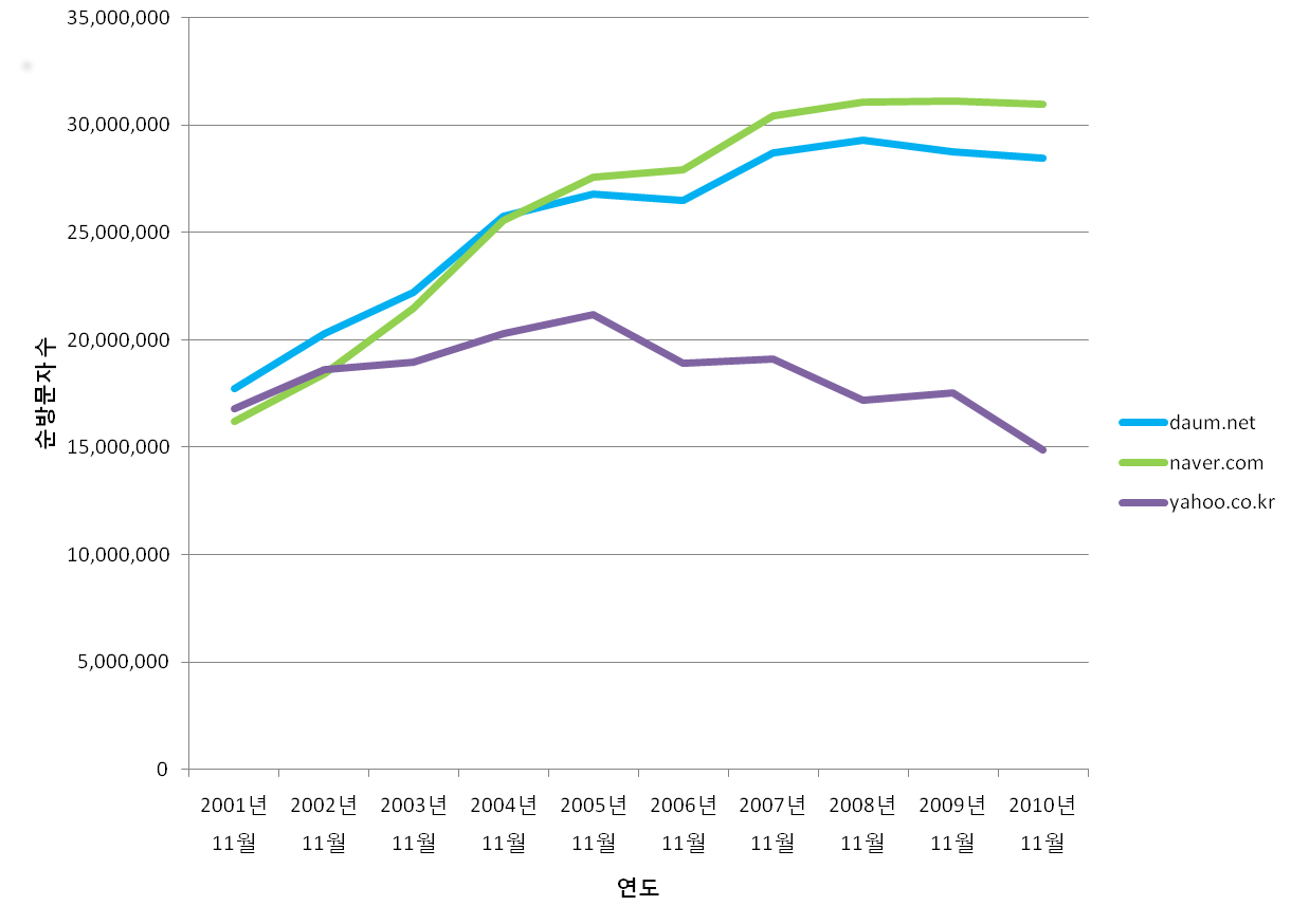 야후 코리아 | 16,806,850 | 18,635,300 | 18,949,418 | 20,284,002 | 21,199,205 | 18,928,434 | 19,095,205 | 17,187,794 | 17,523,699 | 14,855,171 |