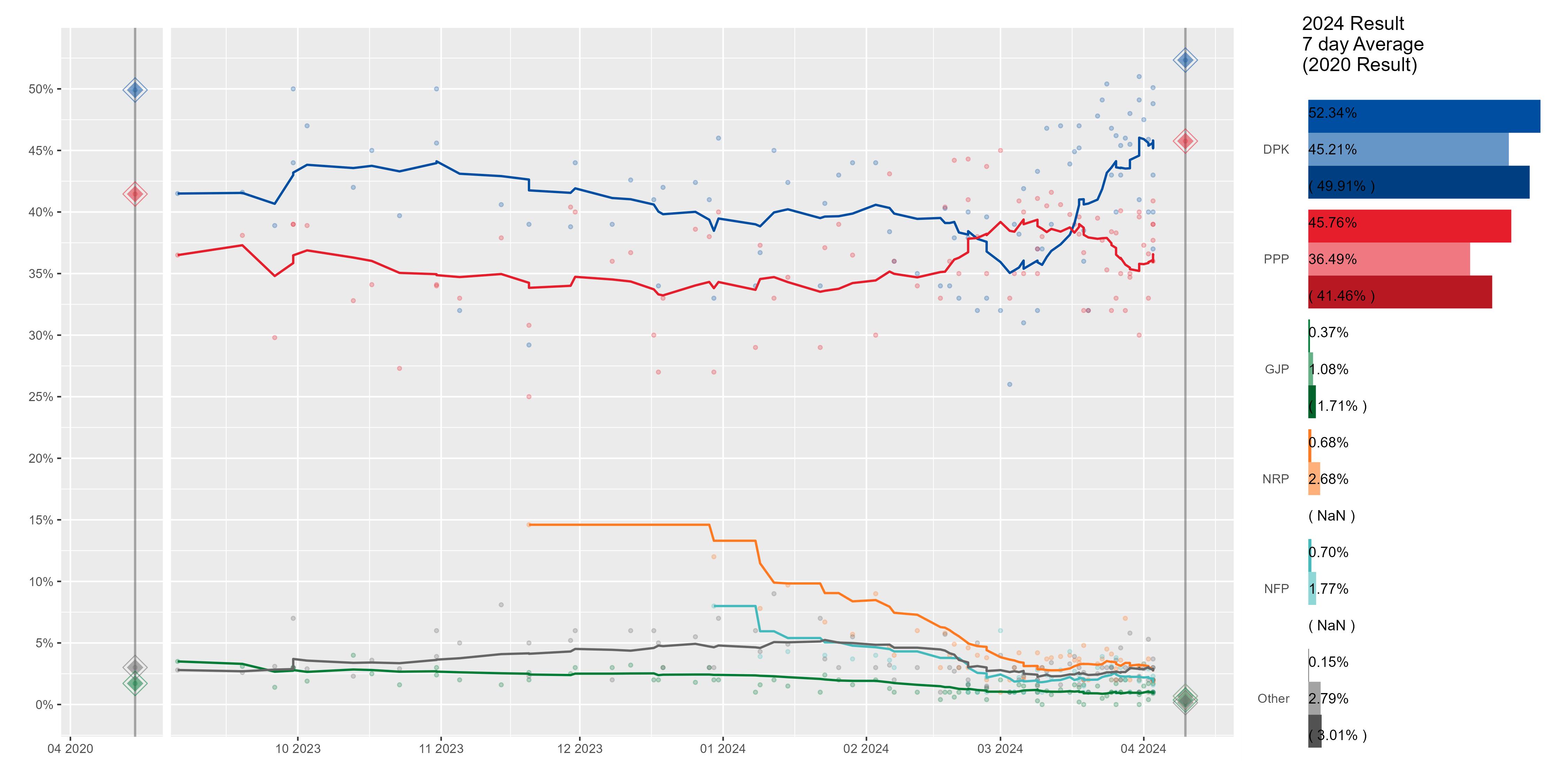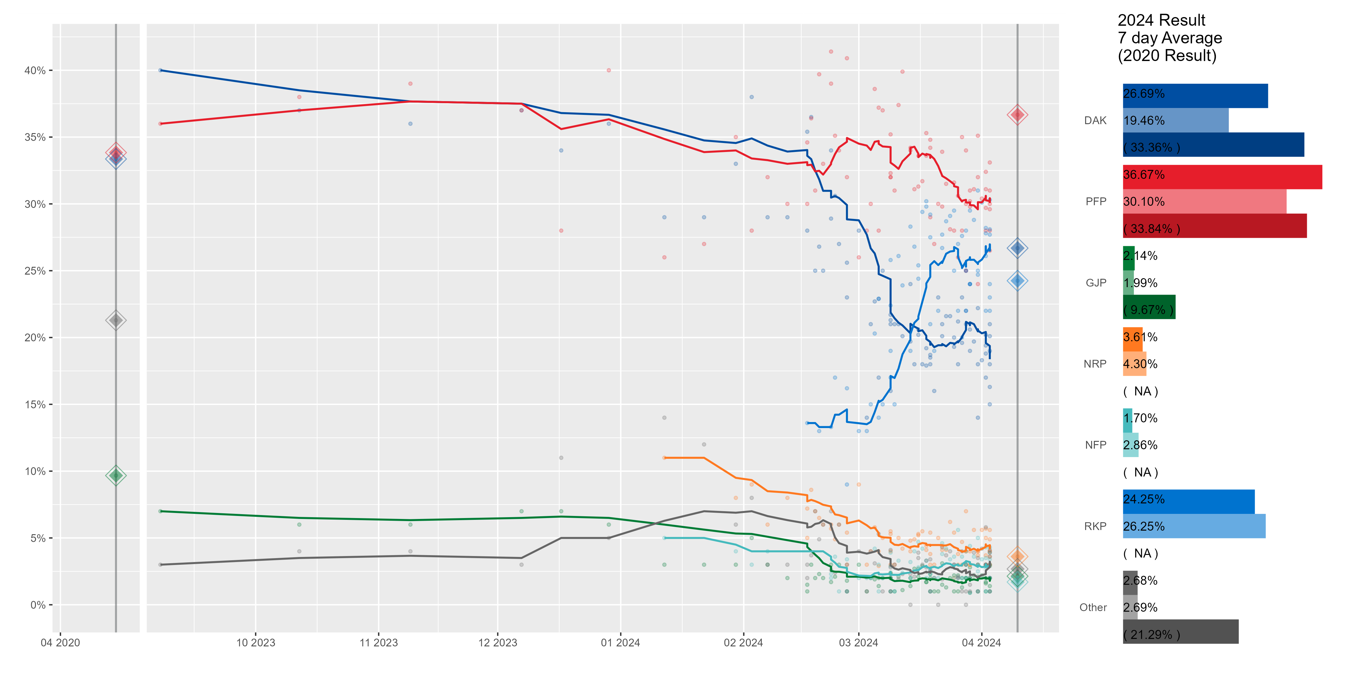 7일 이동평균 막대 그래프를 포함한 비례대표 투표 여론조사의 7일 이동평균 곡선