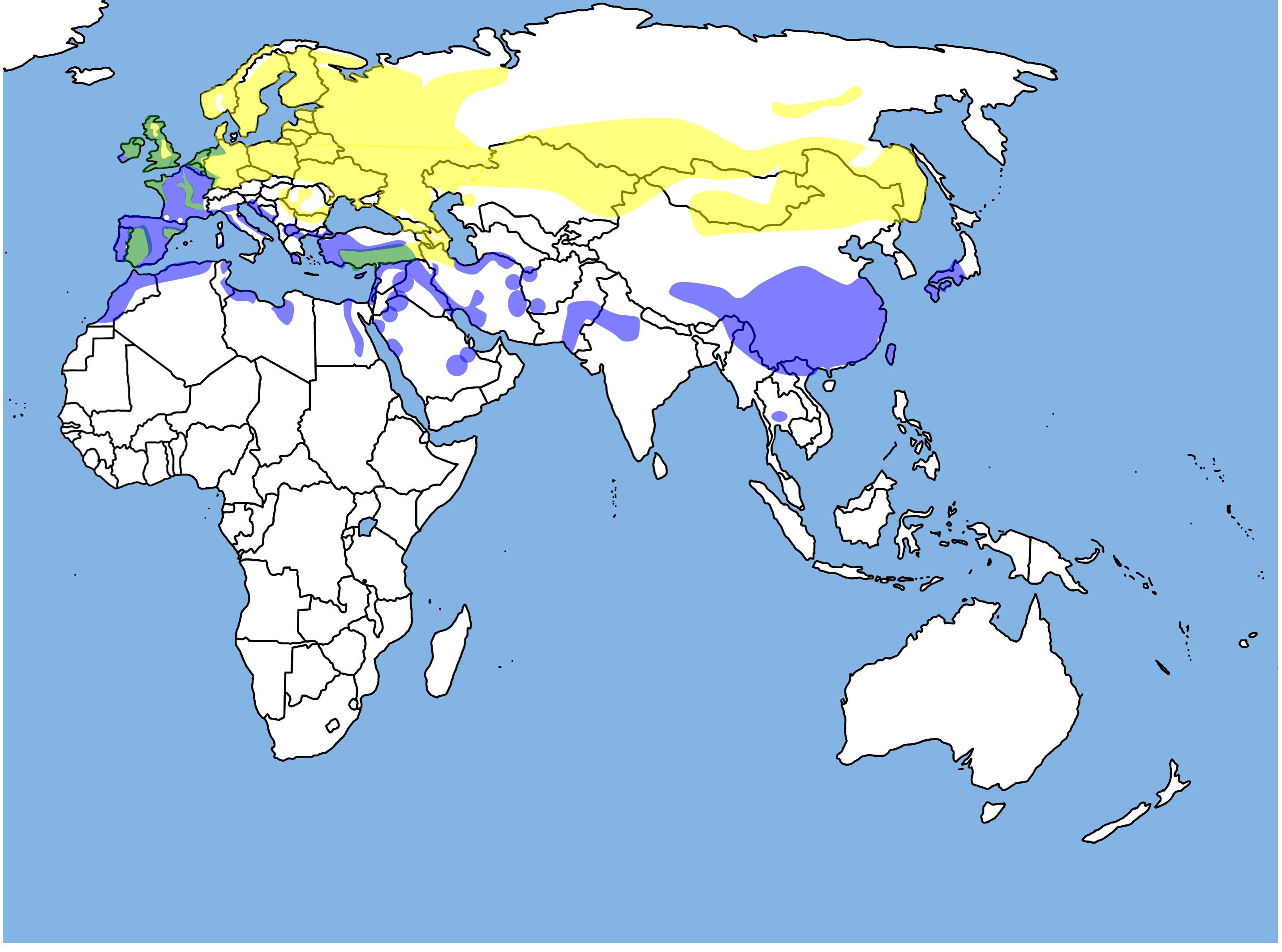 여름에는 유라시아 대륙 중위도의 광범위한 지역에서 번식하고, 겨울에는 아프리카 대륙 북부나 유라시아 대륙 남부, 북인도, 네팔, 부탄 및 중국 등에서 월동한다.[23] 2011년 3월 27일에는 몽골에서 날아온 컬러 플래그가 부착된 개체 (2008년 7월 31일에 부착)가 일본 이시카와현 가가시의 시바야마 호에서 확인되었다.[23]