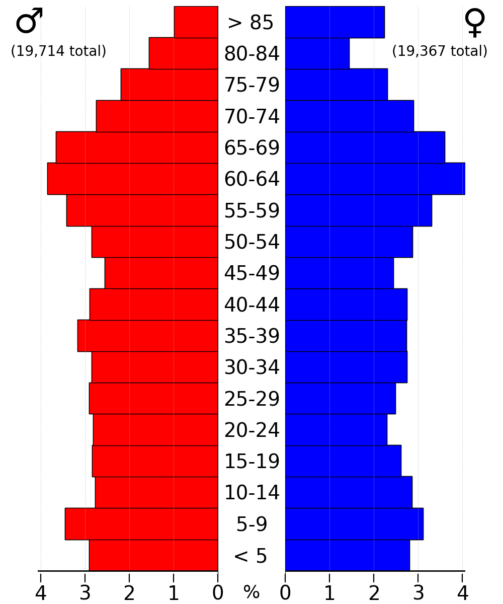 인구 연령 분포는 18세 미만 24.0%, 18~24세 9.2%, 25~44세 25.0%, 45~64세 23.8%, 65세 이상 17.9%였다. 중간 연령은 40세였다. 여성 100명당 남성은 99.0명이었고, 18세 이상 여성 100명당 남성은 96.9명이었다.