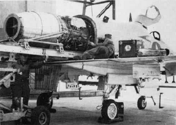 A4D 스카이호크, 후방 동체 제거 후 엔진을 제자리에 밀어넣는 모습, 주일 미 해병대 이와쿠니 항공 기지, 1959년