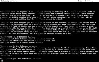 더 위트니스는 1983년 인포컴에서 출시한 텍스트 어드벤처 비디오 게임이다. 1938년 캘리포니아 로스앤젤레스 교외의 가상 도시 카베자 플라나를 배경으로, 플레이어는 살인 사건의 유일한 목격자가 되어 사건을 해결해야 한다. 게임은 1930년대 시대상을 반영하여, 당시의 속어와 시어스 카탈로그, 라디오 방송 등을 활용했다. 게임 패키지에는 관련 문서와 소품이 포함되어 몰입감을 높였으며, 비평가들의 호평을 받았다. 1984년 아키 어워드에서 최고의 컴퓨터 어드벤처 상을 수상했다.