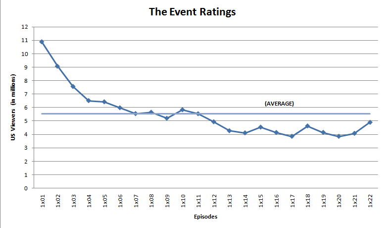 파일럿 에피소드는 1,088만 명의 시청자와 성인 18–49세 시청률/시청 점유율 3.6/9를 기록하며 동시간대 오후 9시에 3위를 기록했다.[68] 첫 4개 에피소드의 평균 시청자 수는 910만 명이었고, NBC는 이 시리즈를 정규 시즌으로 편성했다.[1] 그러나 2010년 11월 29일 마지막 에피소드에서는 시청자 수가 46%, 시청률이 48% 감소하여 각각 583만 명과 1.9/5를 기록했다.[69] 11월 15일, NBC는 "더 이벤트"가 11월 29일 에피소드 이후 휴방에 들어가 2011년 2월 28일에 돌아올 것이라고 발표했다.[71] (나중에 3월 7일로 연기되었다).[72] 복귀 후, 이 시리즈는 523만 명의 시청자와 당시 시리즈 최저 시청률인 1.4/4 (18–49 시청률/점유율)를 기록했다.[73] 이 시리즈는 4월 18일에 처음으로[75], 그리고 5월 9일에 다시[76] 385만 명의 시청자와 1.1/3 시청률/점유율로 최저치를 기록했다.