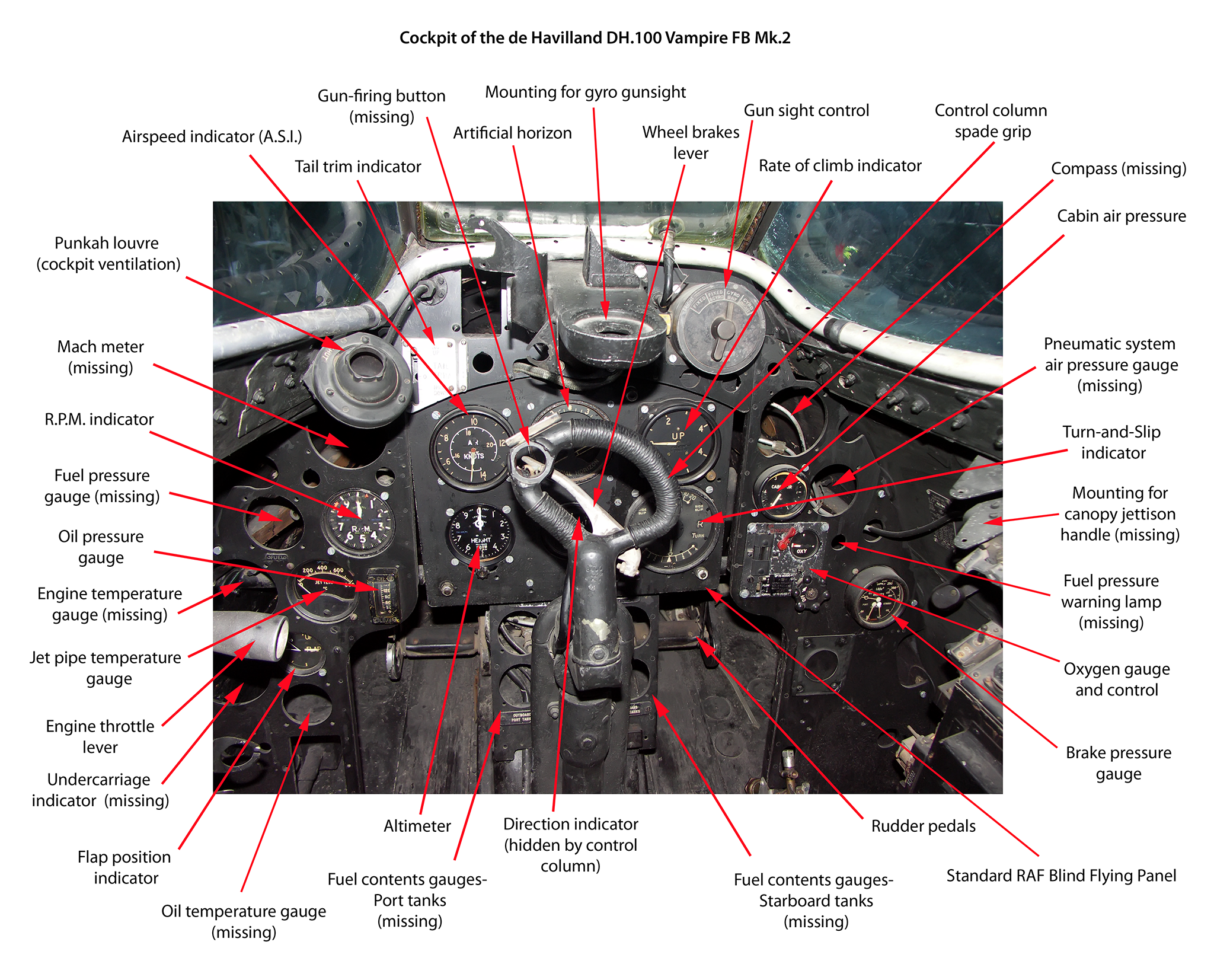 드 하빌랜드 뱀파이어는 오직 수동으로만 조종할 수 있었고, 레이더가 없었으며, 단순한 구조를 가진 비교적 간단한 비행기였다. 프로펠러를 제외하면 재래식 기술과 관습이 적용된 항공기였다.