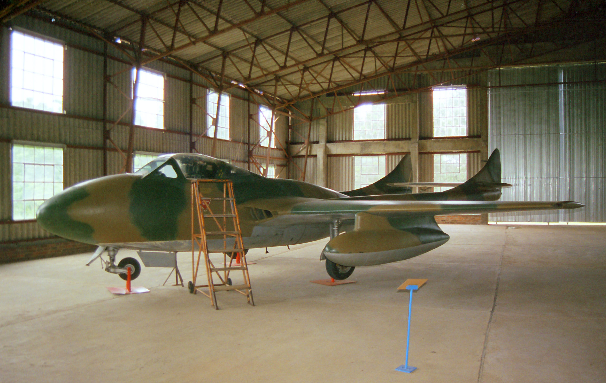 1941년 1월, 헨리 티저드 경은 드 하빌랜드 항공사에 비공식적으로 접근하여 당시 개발 중이던 혁신적인 새로운 제트 추진 기술을 사용하는 전투기를 설계할 것을 제안했다. 공식적인 사양은 발표되지 않았지만, 드 하빌랜드는 날개 뿌리에 공기 흡입구를 설치하여 중앙에 장착된 원심 압축기를 사용하는 엔진에 공기를 공급하는 단일 엔진 항공기 설계를 시작했다.항공기 엔진 설계자인 프랭크 핼퍼드 소령은 프랭크 휘틀의 가스 터빈에 대한 선구적인 연구를 접할 수 있었고, 이를 바탕으로 제트 추진 전투기를 위해 당시 높은 추력으로 여겨졌던 3,000lb의 추력을 발생시키는 "직통형(straight-through)" 원심 엔진 설계를 진행했다. 핼퍼드의 엔진은 핼퍼드 H.1으로 개발되었다. 1941년 4월 엔진 설계 작업이 완료되었고, 1년 후 시제품 H.1 엔진이 첫 시험 운행을 수행했다.[59]