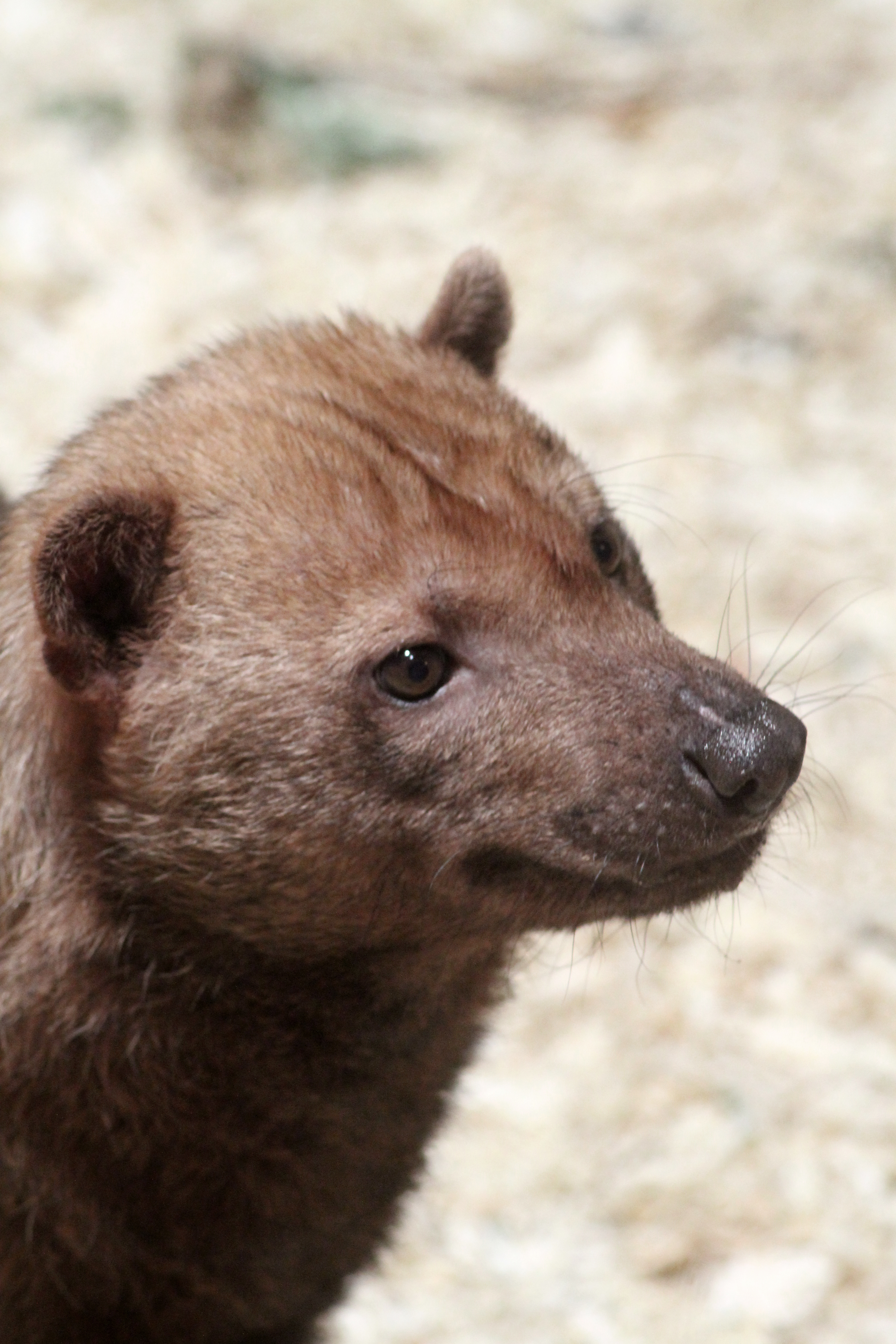 주둥이는 짧고 넓다. 전신은 짧은 털로 덮여 있다. 체색은 짙은 갈색이다. 머리와 목 부분은 황갈색, 복면과 사지·꼬리는 검은색이다.