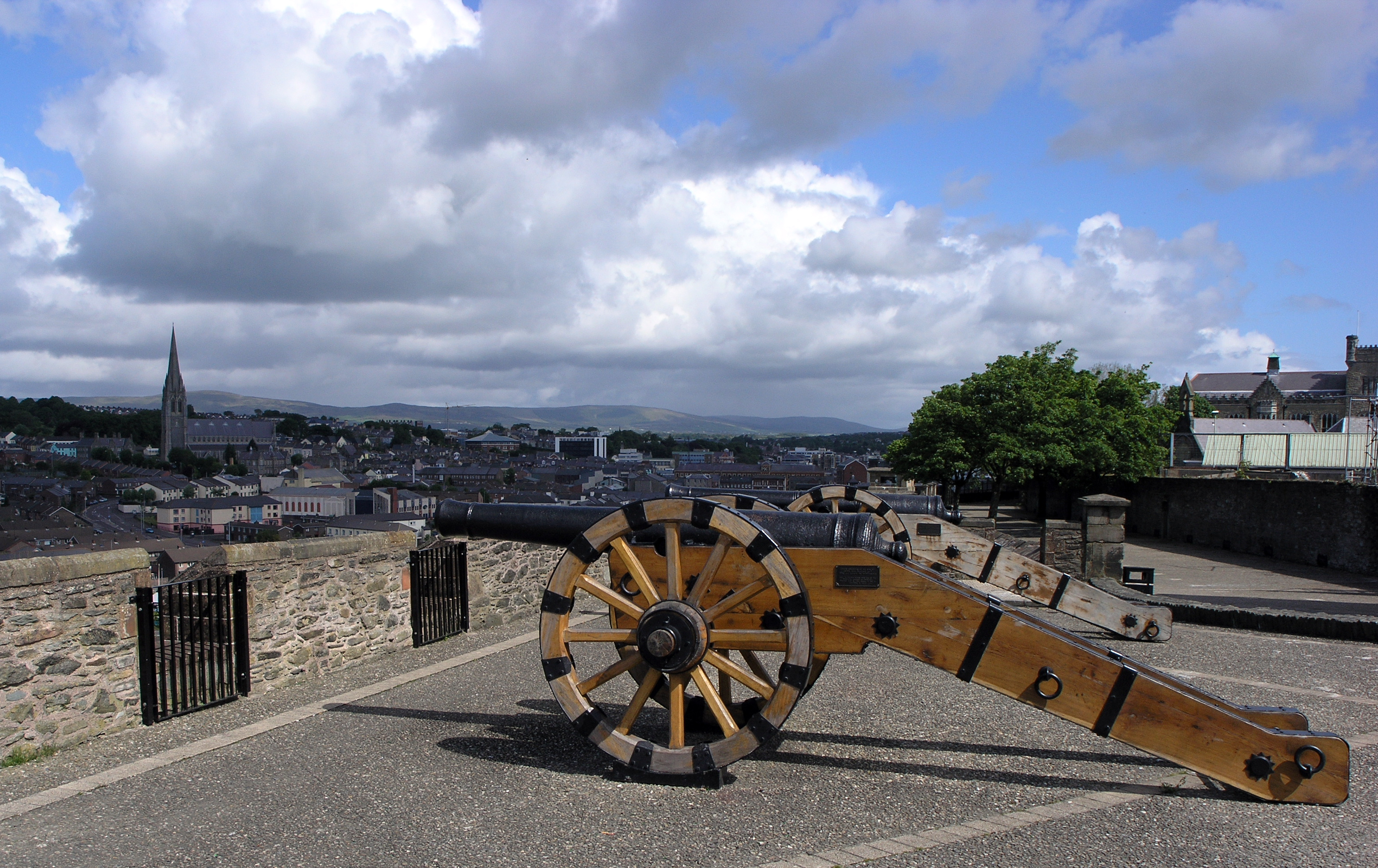 데리는 아일랜드에서 가장 오래된 정착지 중 하나로, 6세기 성 콜룸바가 세운 수도원에서 그 기원을 찾을 수 있다.[53] 17세기 초 얼스터 식민의 일환으로 런던의 리버리 회사들이 런던데리를 건설하면서, 아일랜드 최초의 계획도시가 탄생했다. 성벽 건설은 1619년에 완료되었으며, 그 비용은 10757GBP였다.[410]
