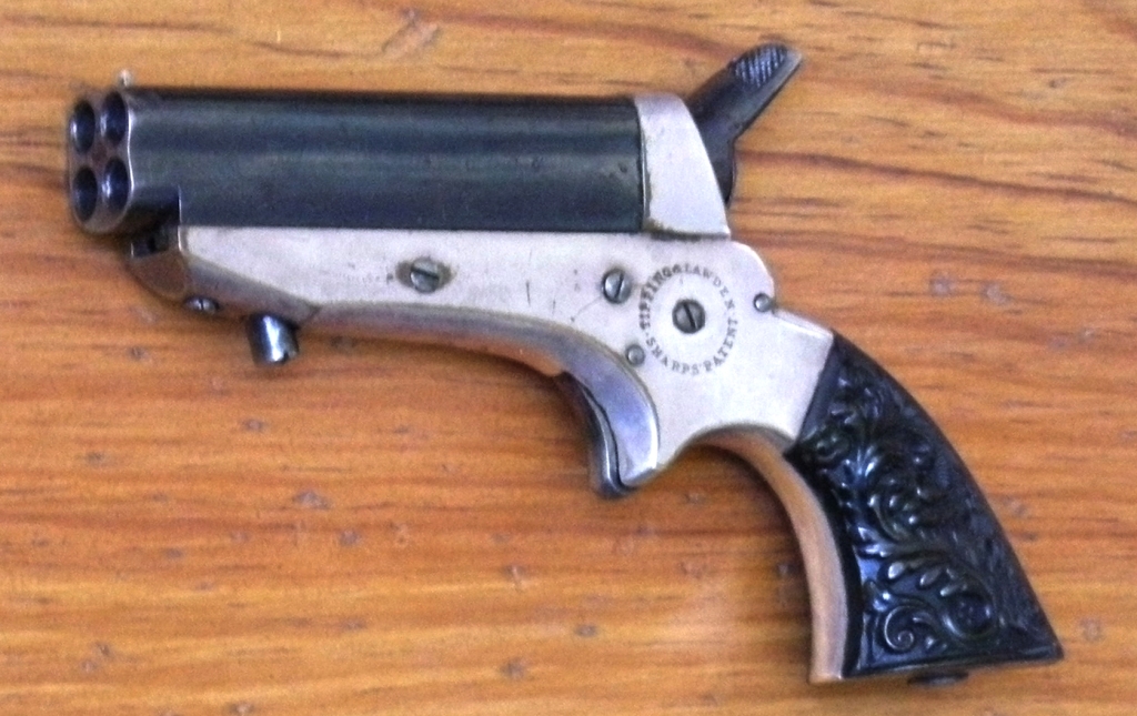 구미 시대에 흔히 볼 수 있었던 데린저 중 하나는 샤프스 데린저였다.[13] 샤프스 데린저는 회전하는 발화핀이 있는 4배럴 단동작 페퍼박스이다. .22, .30, .32 림파이어 탄약을 사용했으며, 장전 및 배출을 위해 4개의 배럴이 앞으로 미끄러지는 구조였다. 1849년에 처음 특허를 받았으나, 실용적인 데린저 설계에 대한 특허는 1859년에 획득했다. 초기 모델은 황동 프레임을 가졌고, 당시 새롭게 도입된 .22 림파이어 금속 탄약을 사용했다. 두 번째 모델은 .30 림파이어 데린저였다. 세 번째 모델은 철 프레임을 가진 .32 림파이어였고, 배럴 해제 장치가 프레임 아래에서 왼쪽으로 이동했다. 네 번째 모델 역시 .32 림파이어였으며, 새로운 "조류 머리" 그립과 약간 짧아진 배럴을 가졌다는 점을 제외하면 세 번째 모델과 거의 동일했다. 이 소형 권총의 생산은 1874년 크리스천 샤프스가 사망하면서 중단되었다.