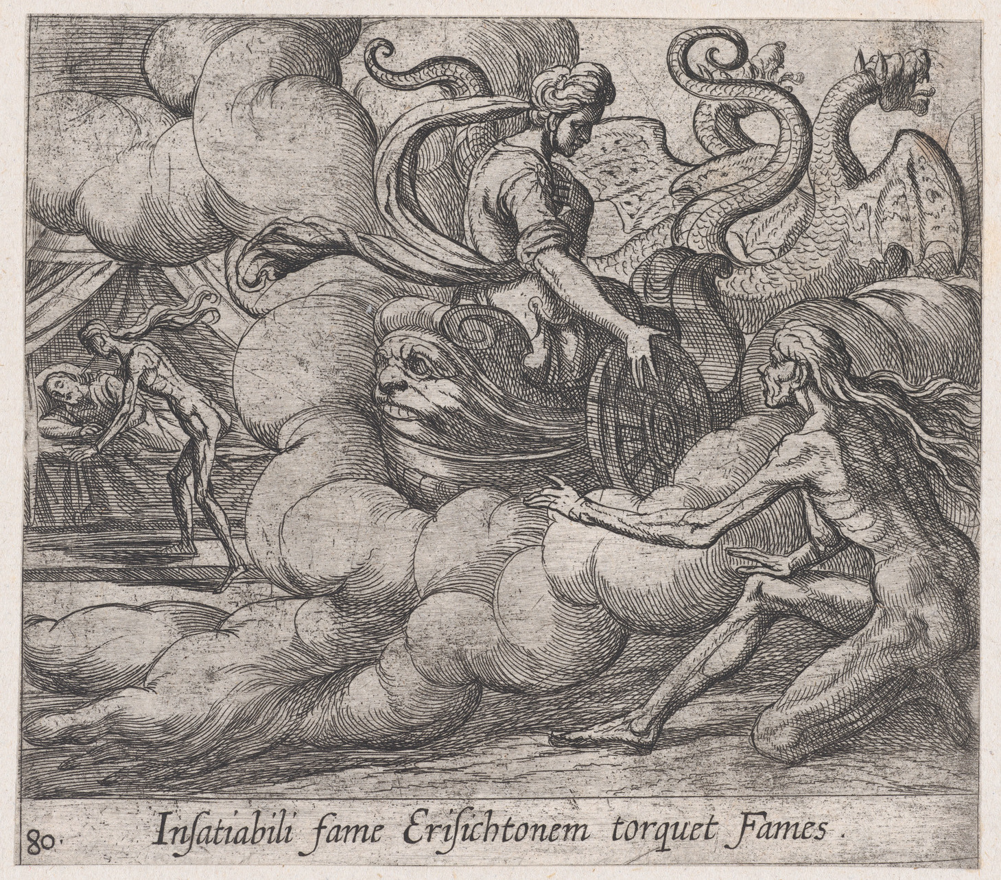 데메테르는 리모스라는 굶주림의 정령을 에리식톤에게 보내 벌했다. 에리식톤은 먹어도 먹어도 배가 고팠고, 결국 모든 재산을 팔아 음식을 샀지만 여전히 굶주렸다. 그는 딸 메스트라를 노예로 팔았지만, 메스트라는 이전 연인 포세이돈의 도움으로 어떤 생물로든 변신하여 도망쳤다. 에리식톤은 딸의 변신 능력을 이용해 여러 번 팔아 돈을 벌었지만, 아무리 많은 음식을 먹어도 굶주림은 채워지지 않았다. 결국 에리식톤은 자신의 몸을 먹었고 죽음에 이르렀다.[121]