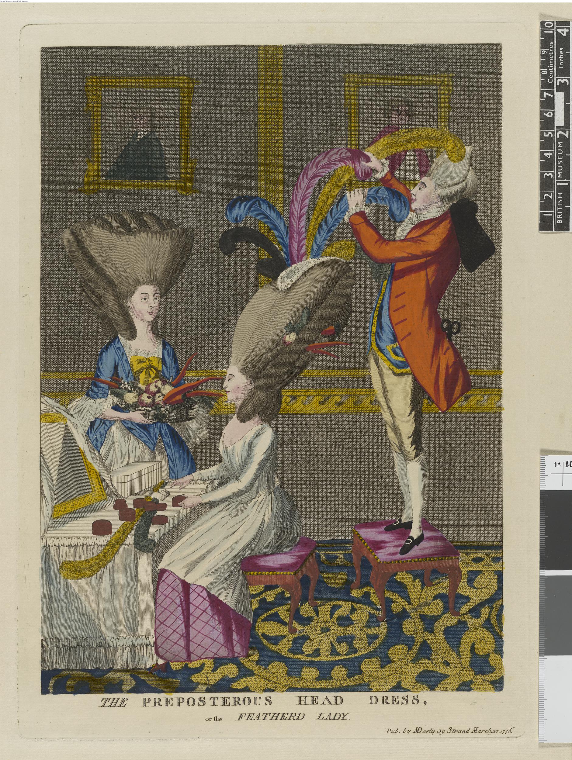 데번셔 공작부인 조지아나 캐번디시는 당대 사교계를 이끄는 인물로서, 그녀의 스타일은 큰 주목을 받았다.[18] 그녀는 마리 앙투아네트와 비견될 만한 패션 아이콘이었으며, 우아하고 화려한 스타일로 잉글랜드 패션의 유행을 선도했다. 조지아나가 착용한 의상과 헤어스타일은 즉시 대중에게 모방되었으며, 특히 그녀의 머리 스타일은 매우 높고 화려한 것으로 유명했다. 1774년 스토몬트 경에게 선물 받은 약 1.22m 길이의 타조 깃털 장식은 하룻밤 사이에 큰 인기를 끌었다.[18][1] 토머스 게인즈버러가 그린 그녀의 초상화 중 커다란 모자를 쓴 모습은 당시 센세이션을 일으켰고, 이 스타일은 '게인즈버러 모자' 또는 '초상화 모자'로 알려지며 널리 유행했다. 그녀의 지위, 재치, 개성, 타고난 스타일 감각은 그녀를 패션 리더이자 인기 있는 인물로 만들었다.[6] 그녀가 언론과 대중에게 얻은 인기는 200여 년 후 그녀의 후손인 웨일스 공작부인 다이애나가 경험한 것과 비교되기도 한다.[18]