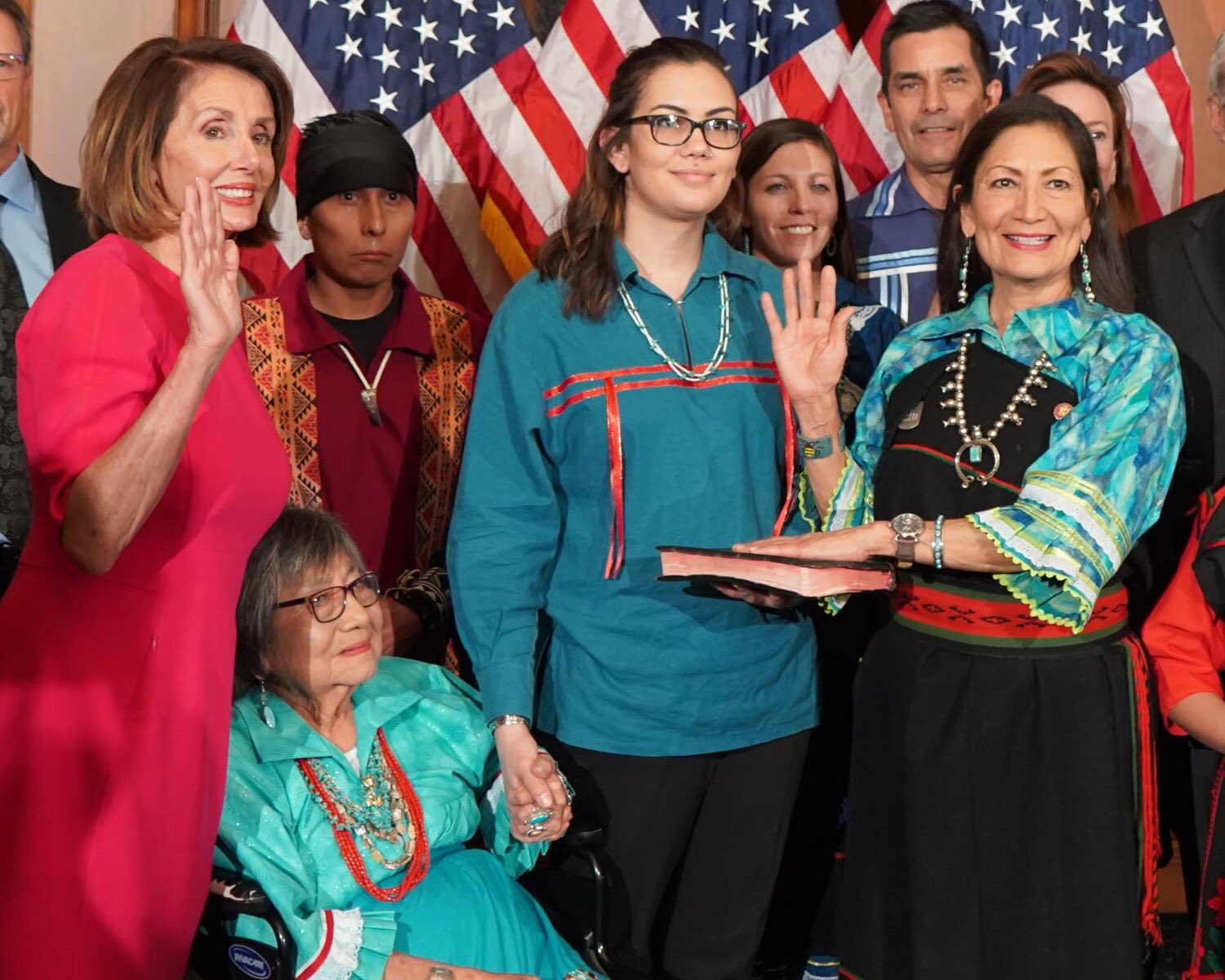 데브 할런드 하원의원(뉴멕시코주, 민주당)이 낸시 펠로시 하원의장의 주재 하에 하원의원 선서를 하고 있으며, 그녀의 어머니 메리 토야와 자녀 소마가 함께 하고 있다.