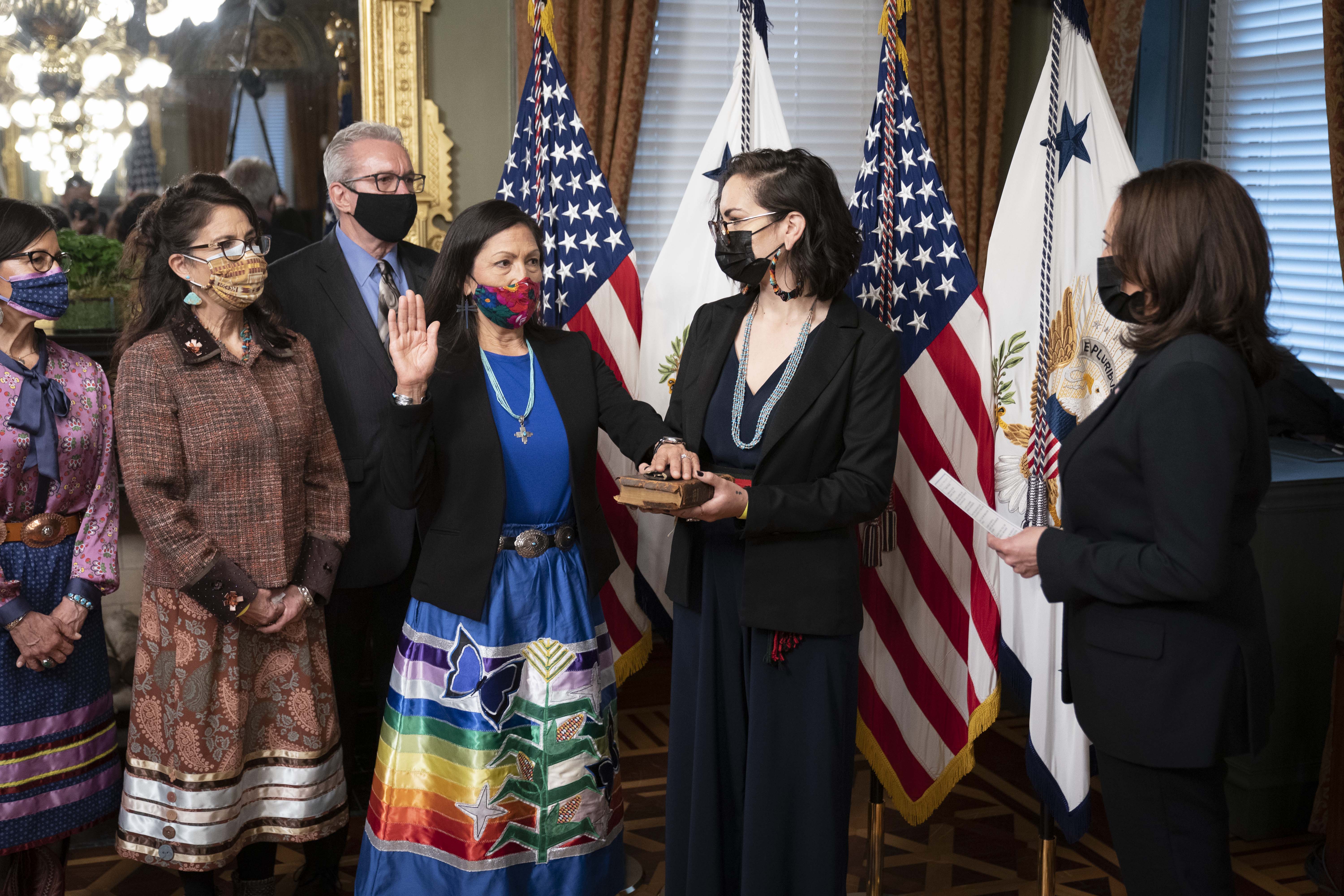 카멀라 해리스 부통령이 할런드에게 내무부 장관 취임 선서를 시키고 있다.