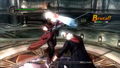네로가 데빌 브링어 능력을 사용하여 단테의 공격을 막는 모습. 상단의 녹색 막대는 네로의 체력을, 노란색 막대는 단테의 체력을 나타낸다.