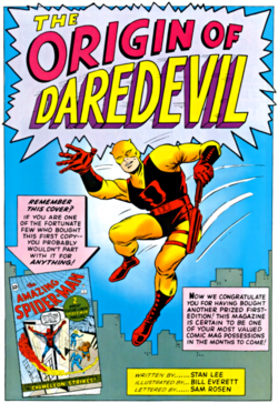 스탠 리와 빌 에버렛[5]이 잭 커비[6]의 캐릭터 디자인 참여로 1964년 4월 ''데어데블'' #1을 출간했다. 커비는 데어데블의 빌리 클럽을 고안했고, 초기 의상의 기본 이미지를 디자인했다.[182] 초기 의상은 검정, 노랑, 빨강의 조합이었다.[7]