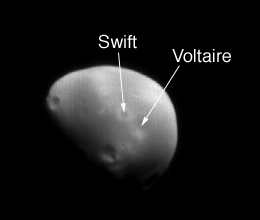 두 크레이터의 이름은 화성에 두 개의 위성이 있을 것이라고 예측한 작가 조너선 스위프트와 볼테르에서 유래했다. 이들은 요하네스 케플러가 먼저 예측한 내용을 인용한 것으로 여겨진다.