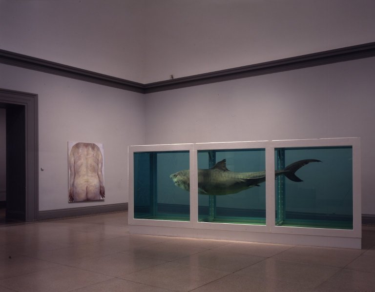 - 〈살아있는 자의 마음 속에 있는 죽음의 육체적 불가능성 (The Physical Impossibility of Death in the Mind of Someone Living)〉(1991년): 포름알데히드 용액에 상어 사체를 넣은 허스트의 대표작이다.[172] 포르말린 용액에 담긴 큰 상어가 전시되어 있으며, 상어가 떠 있는 수조는 세 부분으로 분리된 것처럼 보여 상어가 세 조각으로 잘린 듯한 착각을 일으킨다. 제작 이후 상어를 보존하는 포르말린이 상어의 몸을 갉아먹어 부패의 흔적이 나타나고 있다.[75] 허스트는 상어를 둘러싼 포르말린이 죽음과 부패의 과정이라고 설명한다.[47]