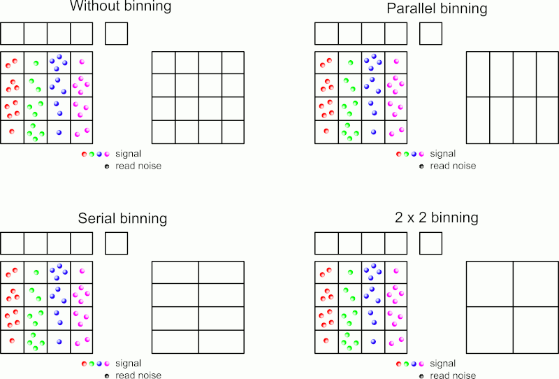 하드웨어 비닝에서는 다음과 같은 방식으로 여러 화소의 신호를 합산한다.