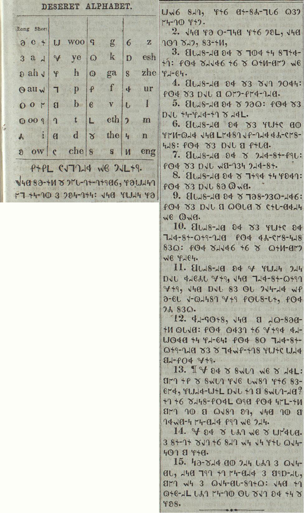 1859년부터 새 활자를 사용하여 ''데저렛 뉴스''는 데저렛 문자로 된 내용을 싣기 시작했다. 주로 ''몰몬경''이나 신약성경의 구절을 매호 하나씩 게재했으나, 이는 약 1년 동안만 지속되었다. 이후 중단되었다가 1864년 5월에 잠시 부활했지만 그해 말에 영구적으로 중단되었다.[77]