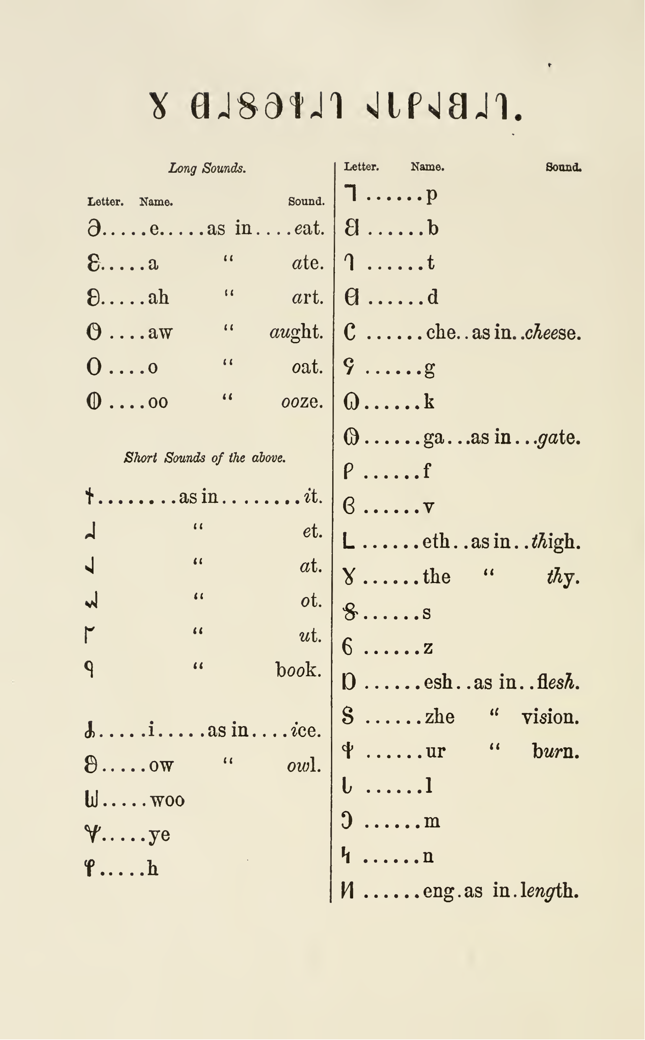--|]]--|]] || Gay || /ɡ/ || --|]]--|]] || Ef || /f/ || --|]]--|]] || Vee || /v/ || --|]]--|]] || Eth || /θ/ | |||||||||||