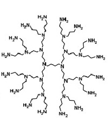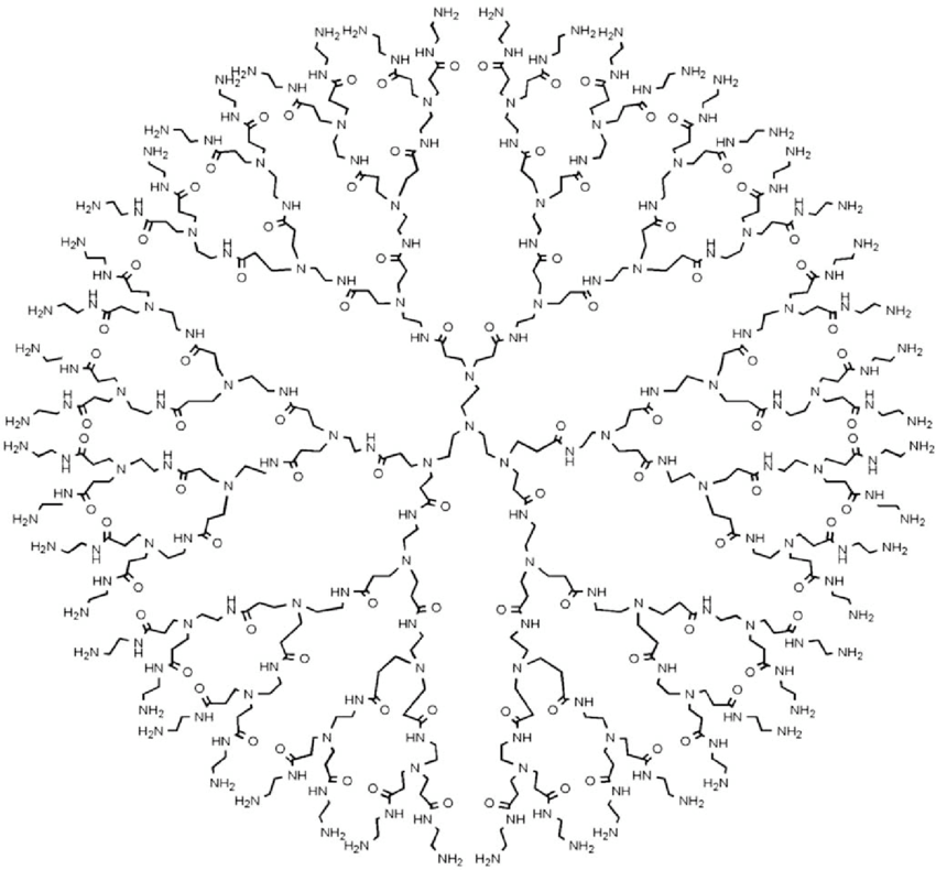 ![]() | 암모니아 또는 에틸렌디아민 개시제 코어를 가지며, 표면에 양전하를 띠어 DNA와 결합하여 형질주입에 사용될 수 있다. 5.0~10.0G PAMAM 덴드리머의 다분산지수는 1.08 미만으로, 각 세대마다 입자 크기 분포가 매우 균일하다는 것을 의미한다. |