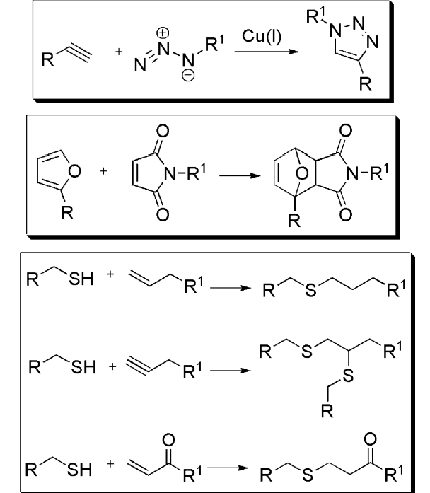 덴드리머는 디엘스-앨더 반응[153], 싸이올-엔과 싸이올-아인 반응[154], 아자이드-알카인 반응[155][156][157]과 같은 클릭 화학을 통해 제조되었다. 덴드리머 합성에 있어서 이러한 클릭 화학은 다양한 가능성을 열어주었다.