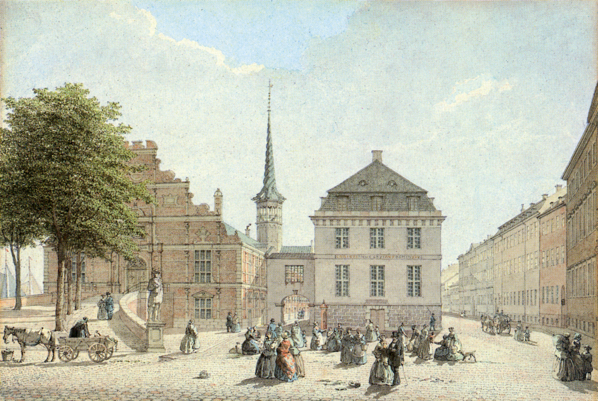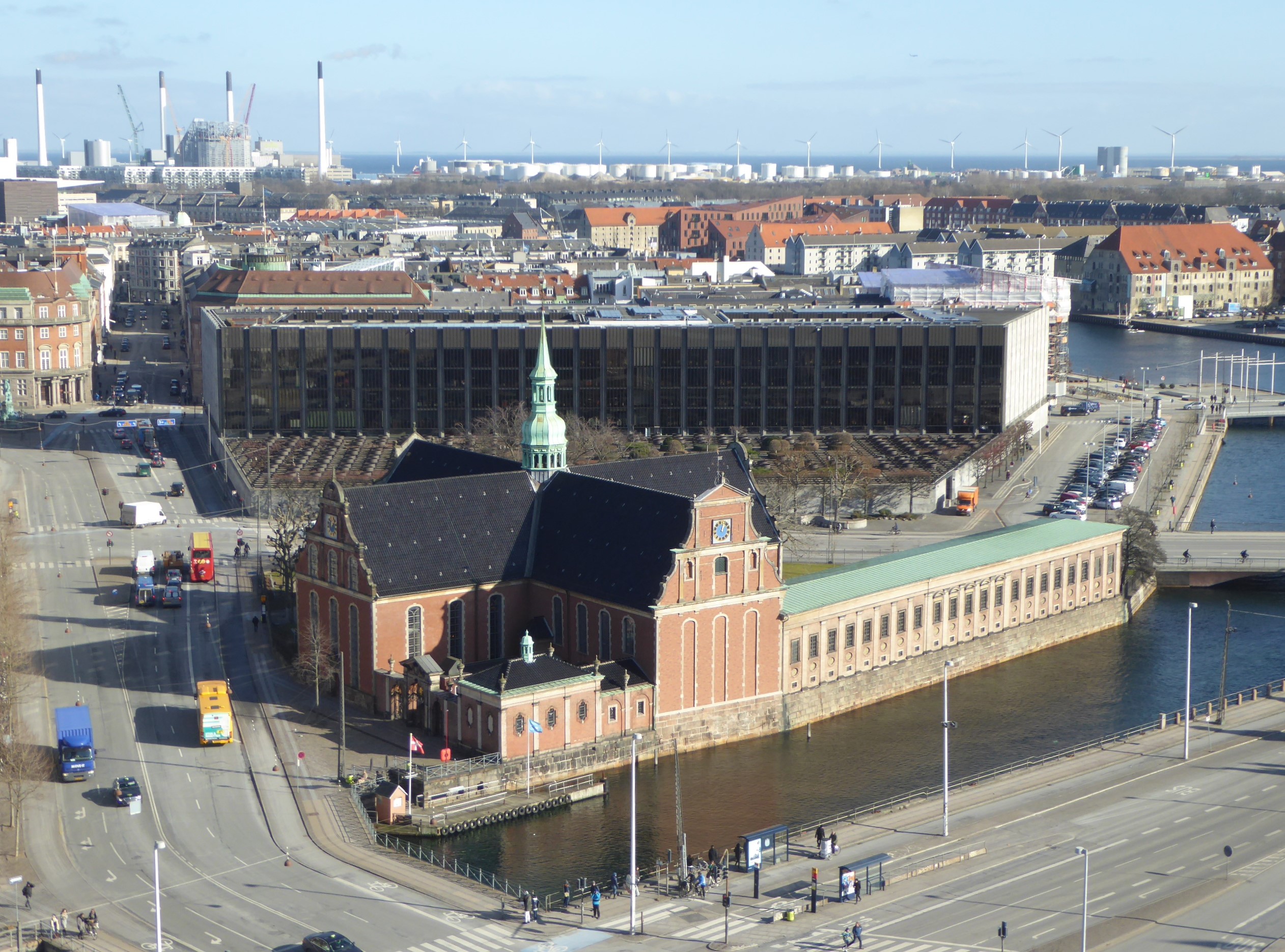 크리스티안보르 궁전에서 바라본 국립은행 건물, 앞쪽에는 홀멘 교회가 보인다
