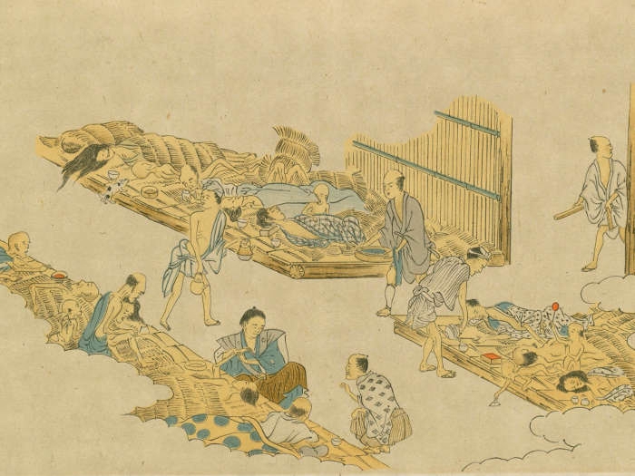 1830년대 덴포 대기근 당시, 급격한 기온 저하와 흉작으로 일본 전역은 큰 고통을 겪었다. 상인들의 물가는 급등했고, "북동부의 한 마을 사망률은 천 명당 37명, 다카야마(高山)시는 거의 45명에 달했다"는 기록이 있을 정도로 많은 사람들이 굶어 죽었다.[5] 농촌의 흉작은 물가 상승과 물자 부족으로 이어져, 사람들은 빈약한 자원을 두고 생존 경쟁을 벌였다.[6] 쌀값 폭등은 경제와 국민 모두에게 큰 타격을 입혔고, 사람들은 "나뭇잎과 잡초, 심지어 짚으로 만든 우비까지 먹었다"고 전해진다.[7]
