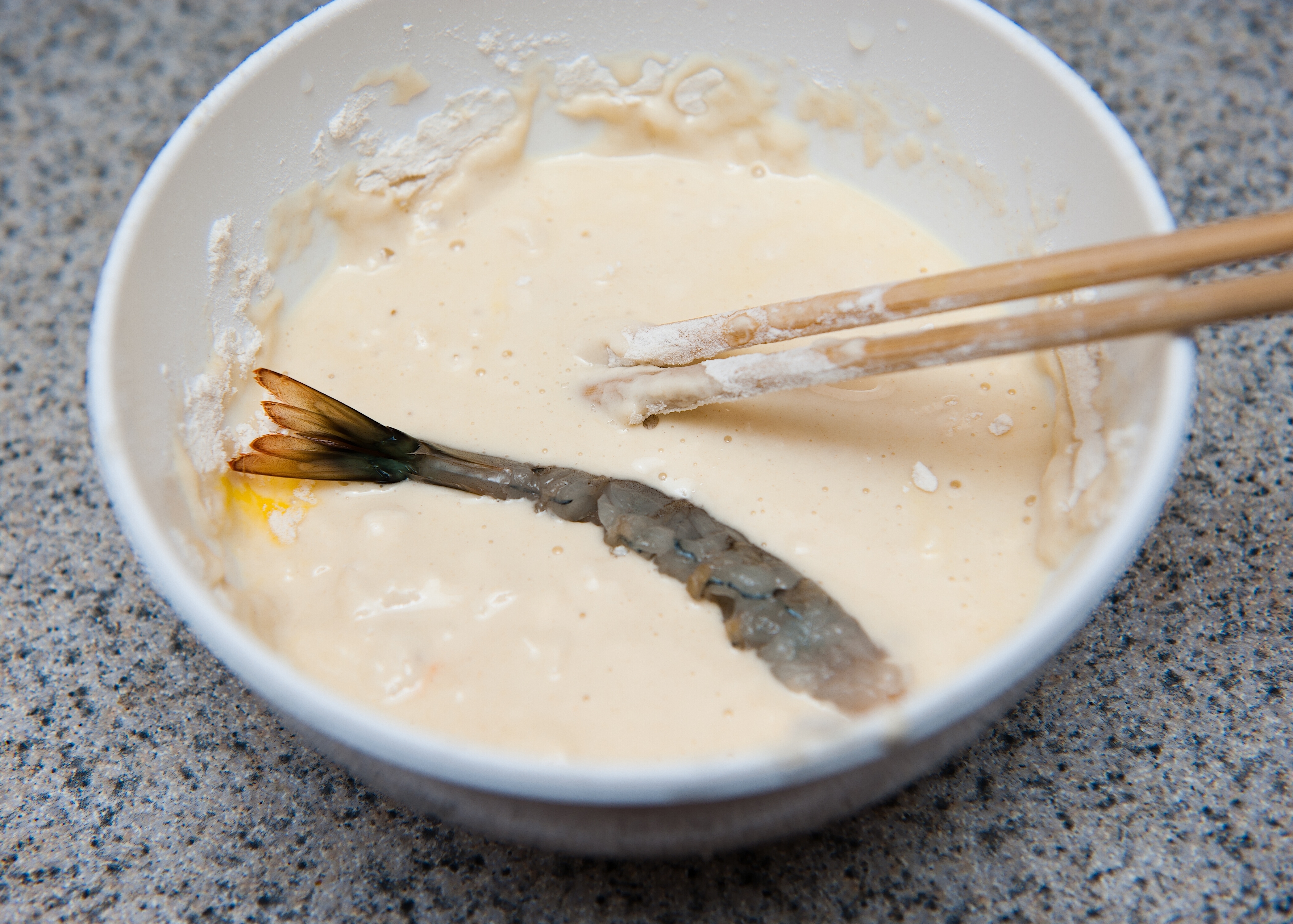 튀김옷은 밀가루, 달걀, 찬물(또는 얼음물)로 만들며, 녹말가루나 쌀가루, 베이킹 파우더 등을 섞은 튀김가루를 사용하기도 한다. 튀김옷에는 조미료나 소금을 첨가하지 않는다.[4]