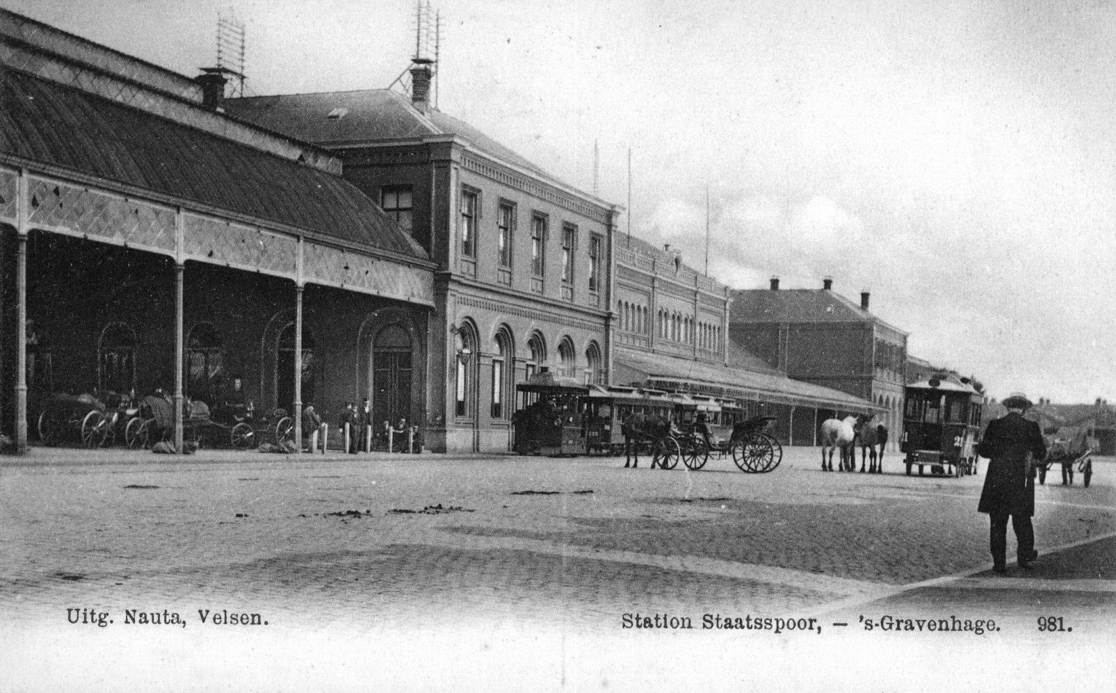 헤이그에서 가장 오래된 역은 1843년 암스테르담레이던 간 철도가 헤이그와 로테르담으로 연장되면서 Hollandsche IJzeren Spoorweg-Maatschappij(HIS)에 의해 개통된 덴 하흐 홀란스 스푸어(Den Haag HS)이다. 이 역은 당시 Rijswijk 시 경계 바로 너머, 시내 중심가에서 다소 떨어진 곳에 위치했다. 1870년, Nederlandsche Rhijnspoorweg-Maatschappij(NRS)는 헤이그 시내 중심가에 더 가까운 두 번째 역인 덴 하흐 린스푸어(Den Haag Rhijnspoor)를 열었다. 이 역은 하우다와 위트레흐트로 가는 동쪽 방향 열차를 운행했다. 1890년 NRS가 국유화되면서 이 하우다-덴하흐선은 Maatschappij tot Exploitatie van Staatsspoorwegen의 소유가 되었고, 역 이름은 덴 하흐 스타츠스포르(Den Haag Staatsspoor)로 변경되었다.