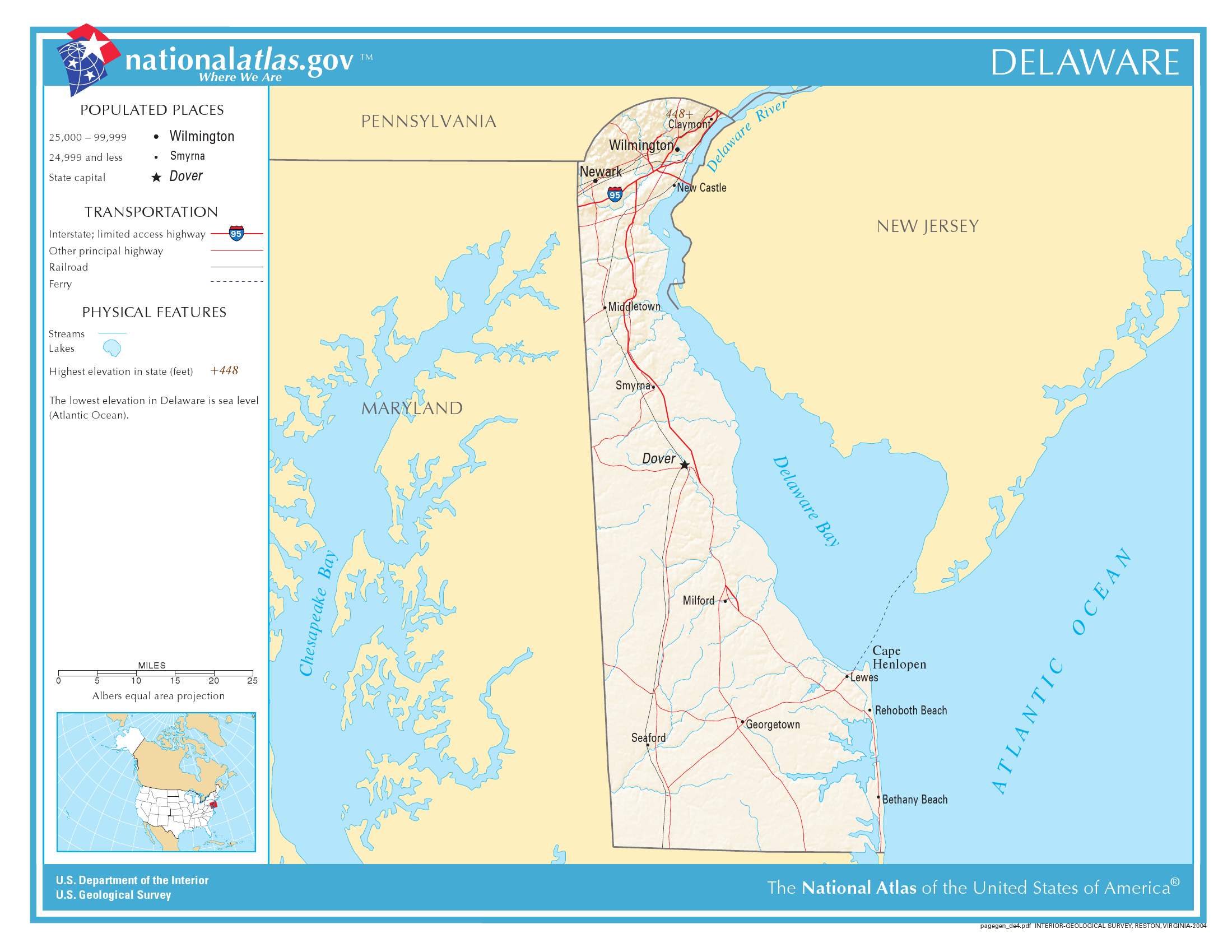 델라웨어주는 미국에서 두 번째로 작은 주로, 펜실베이니아, 델라웨어 강, 뉴저지, 대서양, 메릴랜드와 접해 있다. 17세기 초 유럽인들이 도착하기 전에는 레나페족과 낸티코크족을 포함한 알곤킨족 인디언들이 거주했다. 델라웨어는 1609년 헨리 허드슨의 탐험 이후 네덜란드, 스웨덴, 영국의 지배를 받았으며, 1704년 펜실베이니아로부터 분리되어 독자적인 입법부를 갖게 되었다. 1776년 미국 독립 선언에 참여했으며, 1787년 미국 헌법을 비준한 최초의 주가 되었다. 델라웨어주는 노예제 찬성 주였으나, 남북 전쟁 이후 노예제를 폐지하고 13, 14, 15차 헌법 수정안을 비준했다. 현재 델라웨어는 금융, 화학, 농업이 주요 산업이며, 많은 기업들이 법인 설립을 위해 델라웨어를 선택한다.