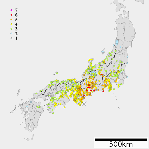 현존하는 기록에 따르면, 미에현 쓰시, 시즈오카현 오마에자키시, 나가노현 스와시(당시 일본은 전시 상태로 군부가 정보를 통제하여 '스와 지진'으로 불렀다)에서 진도 6을, 긴키 지방부터 주부 지방까지 넓은 범위에서 진도 5를 관측했다.[35] 일부 관측소에서는 지진 강도가 측정 범위를 넘어 강도를 모두 기록하지 못하기도 했다. 해외에서도 지진계 등을 통해 대규모 지진이 발생했음을 인지했다.[40]