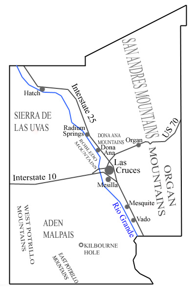 총면적은 9880km2 (약 9880.76km2)이며, 이 중 육지 면적은 9861km2 (약 9860.04km2)이고 수면적은 19km2 (약 18.13km2)로, 군 전체 면적의 0.2%에 해당한다.[8]도냐아나군에는 여러 주요 지형이 있다. 특히 중앙을 남북으로 가로지르는 리오그란데의 범람원인 메실라 계곡과 동쪽 경계를 따라 뻗은 오르간 산맥이 대표적이다. 이 외에도 로블레도 산맥, 도냐아나 산맥, 시에라 데 라스 우바스, 산 안드레스 산맥의 남쪽 끝자락, 이스트 포트릴로 산맥, 웨스트 포트릴로 산맥 등이 있다. 또한 라스 크루세스 동쪽에 위치한 토르투가스 산과 서쪽에 위치한 피카초 봉과 같은 작고 고립된 산 두 개도 포함된다. 도냐아나군은 뉴멕시코의 4대 용암 평원 중 하나인 에이든 말파이스(Aden Malpais)와 세계에서 가장 큰 마르 중 하나인 킬번 홀(Kilbourne Hole)을 포함한다.