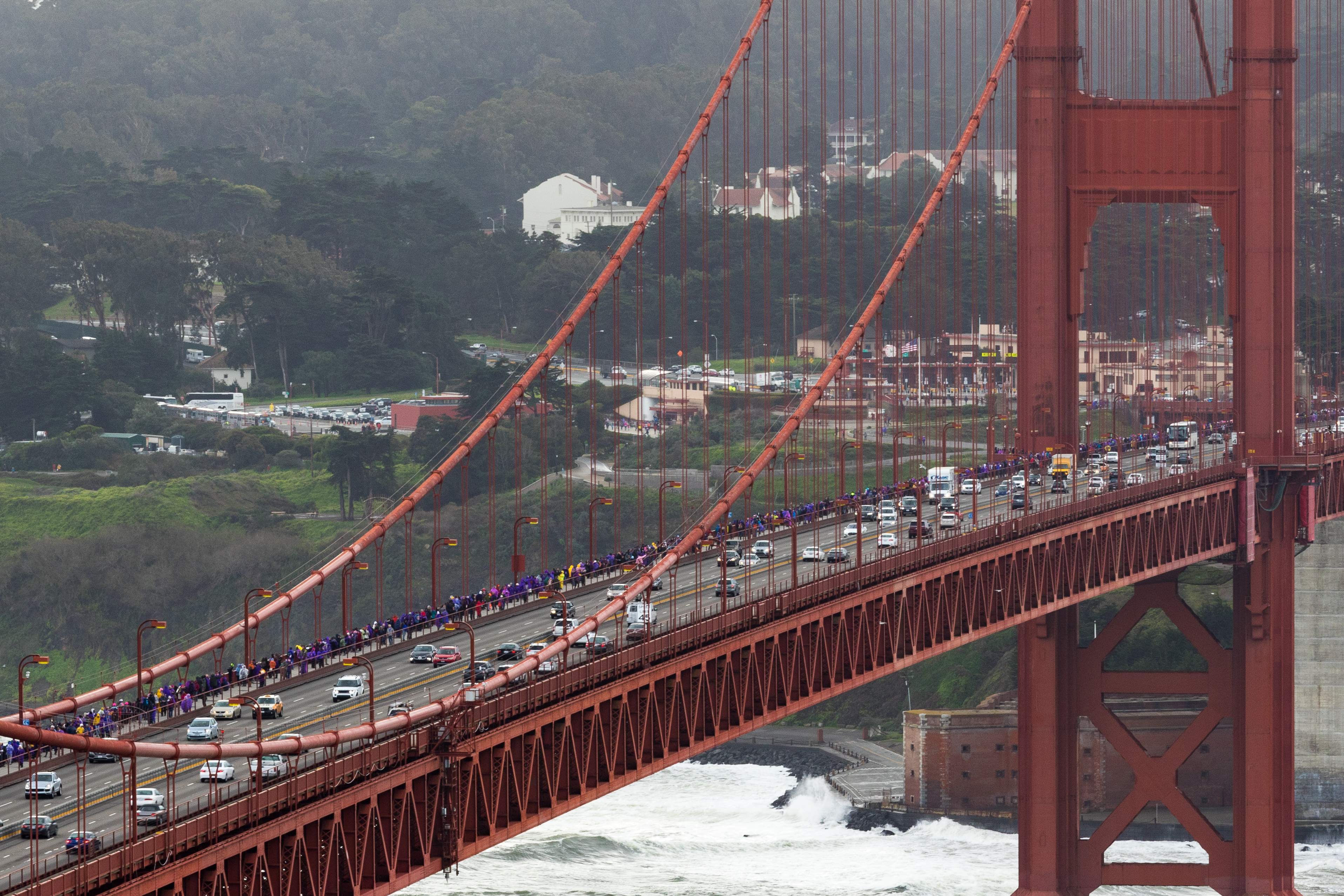도널드 트럼프 취임식에 평화적으로 반대하기 위해 골든 게이트 브리지에서 인간 띠를 형성한 시위대 (많은 사람들이 보라색 옷을 입고 있다)