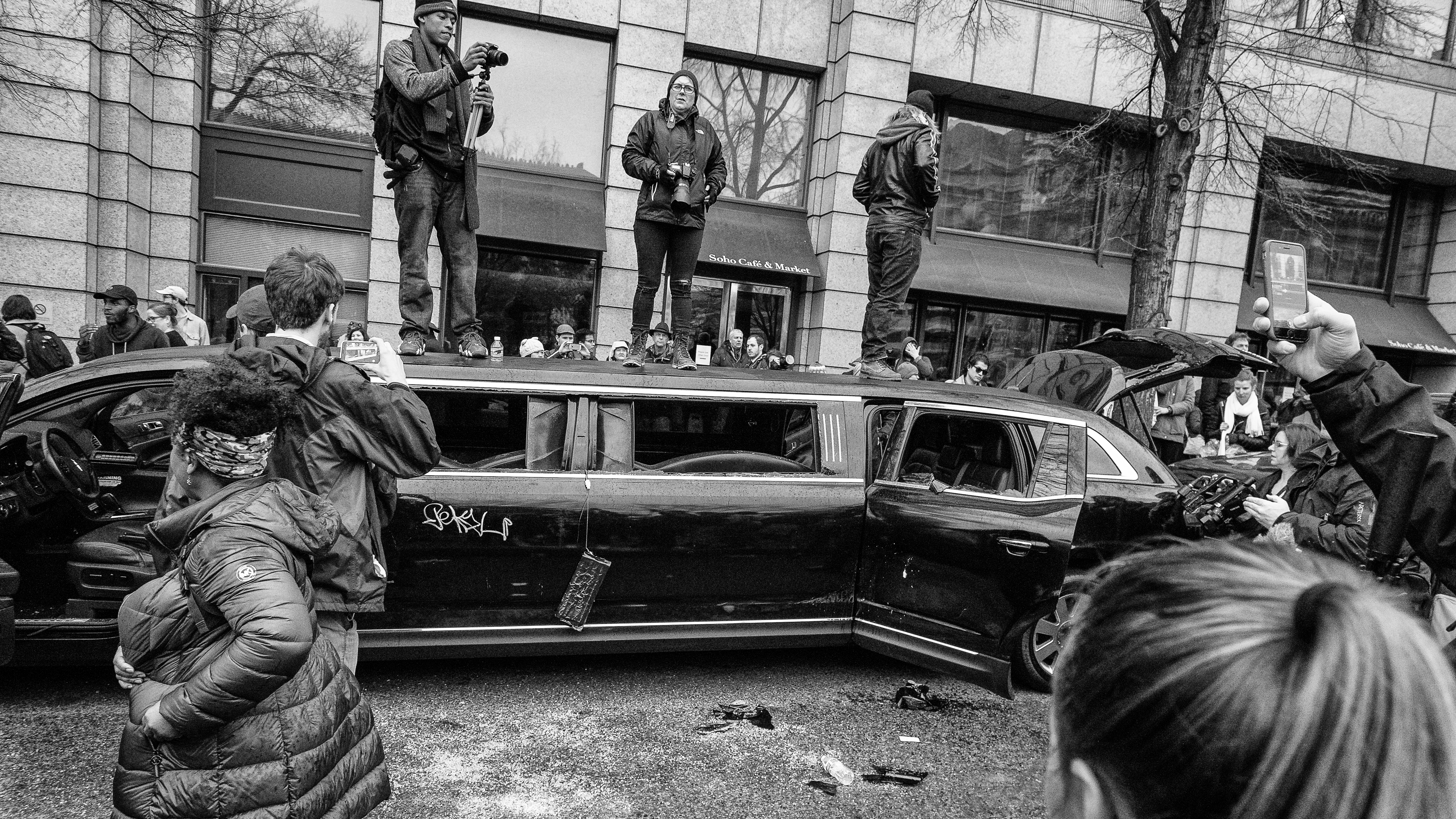 리무진에 낙서가 칠해지고 창문이 깨졌으며 나중에는 불이 붙었다.[131] 이 리무진은 무슬림 이민자가 소유했다.[132] 불은 리무진 뒤에 주차된 폭스 뉴스(Fox News) 제작진의 SUV로 번졌다.[133] 총 230명이 체포되었으며, 그중 217명은 중범죄 폭동 혐의로 연방 차원에서 기소되었으며, 유죄 판결을 받으면 최대 10년의 징역형과 벌금에 처해질 수 있다.[134] 6명의 경찰관이 경미한 부상을 입었다.[135]