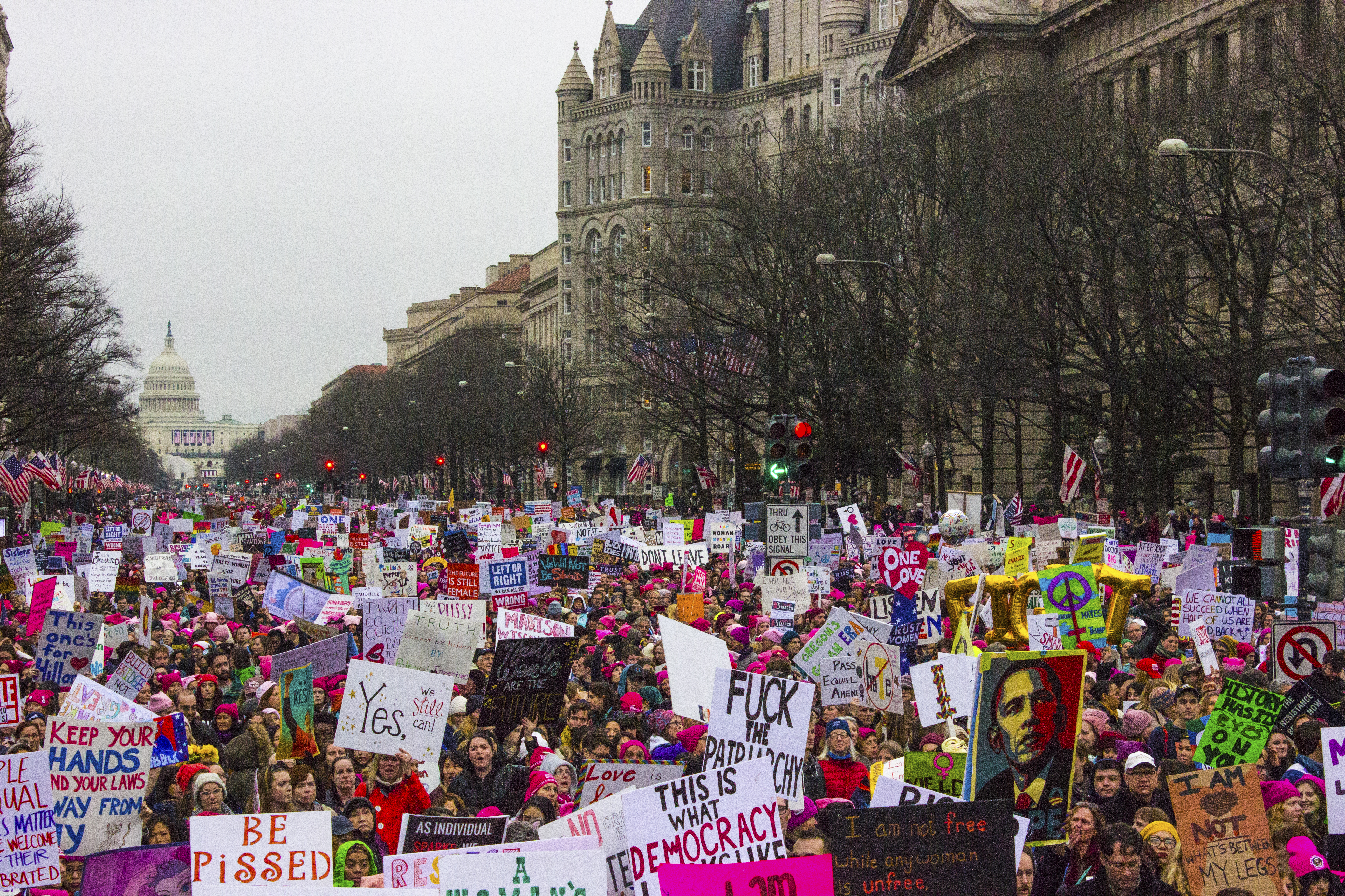 워싱턴 여성 행진은 2017년 1월 21일 워싱턴 D.C.에서 열린 시위로, 도널드 트럼프의 취임 첫날에 항의하기 위해 약 597,000명이 인디펜던스 애비뉴와 서드 스트리트에 모였다.[145][146][147] 동시에 미국 50개 주 전체와 6개 대륙에서 대규모 시위가 열렸다.[145][146][147] 이 시위에는 전국적으로 약 330만에서 460만 명이 참여하여 미국 역사상 가장 큰 규모의 시위가 되었다.[16][148]