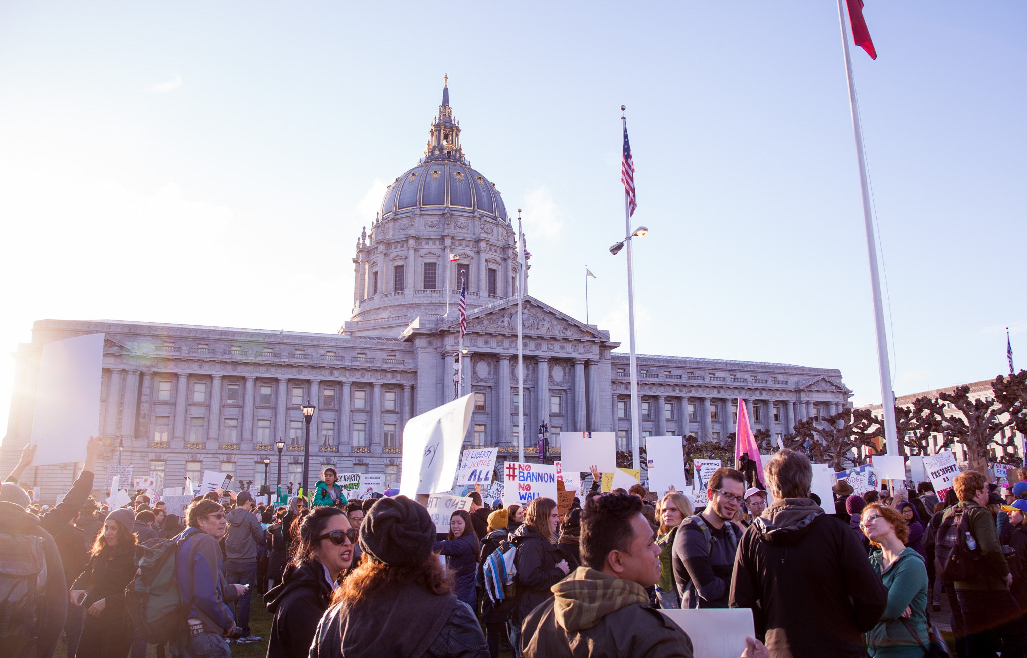 2017년 1월 20일 아침, 트럼프 반대 시위대는 샌프란시스코에 있는 우버 본사를 봉쇄했다. 이는 우버의 최고 경영자가 트럼프와 "협력자"로 여겨졌기 때문이다.[137] 시위 과정에서 약 16명이 체포되었으며, 시위대는 인간 띠를 만들어 사무실을 봉쇄했다.[137] 샌프란시스코에서 금요일 아침에 봉쇄된 다른 회사들은 웰스파고 본사와 칼트레인 철로였다.[137]