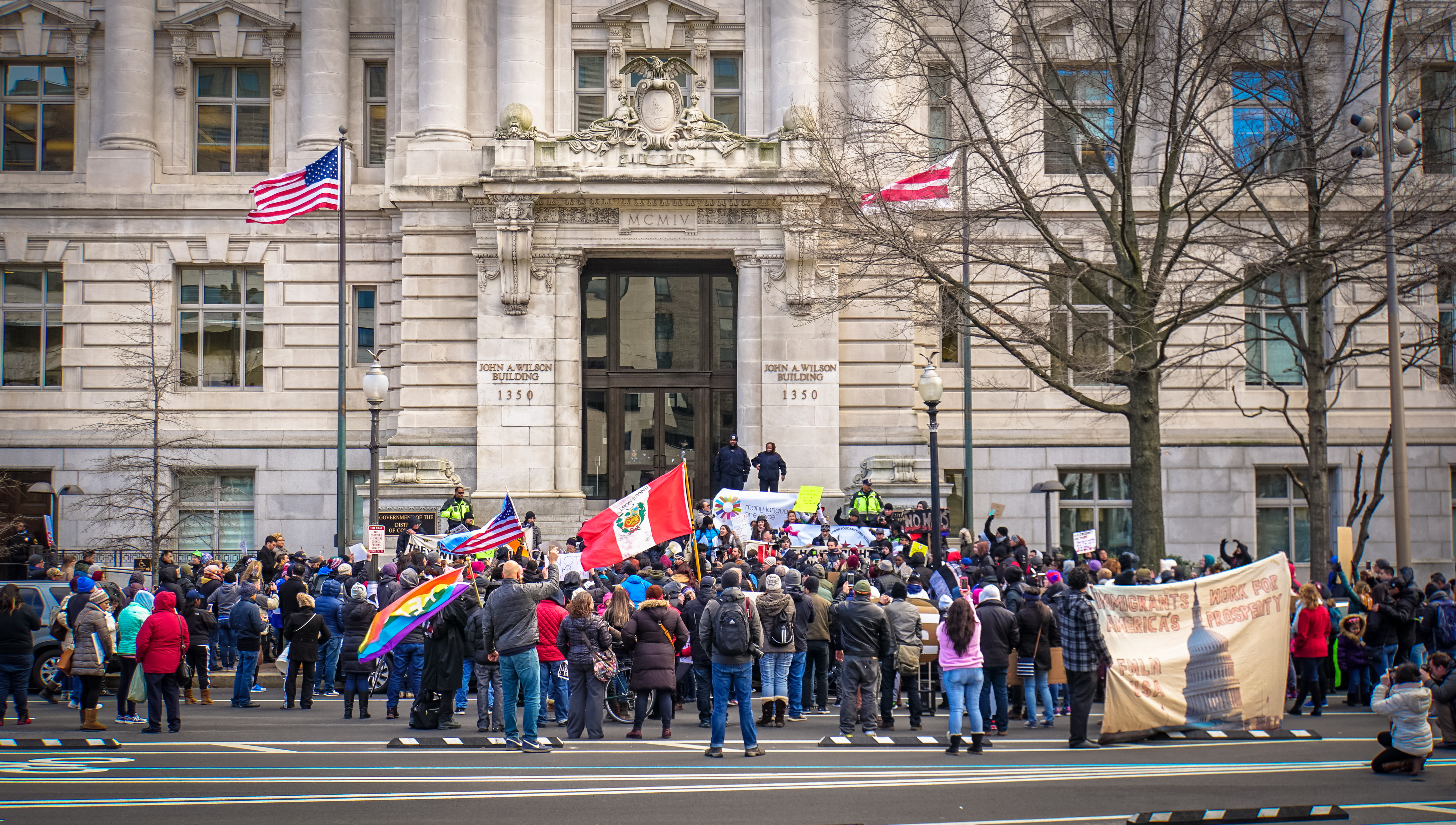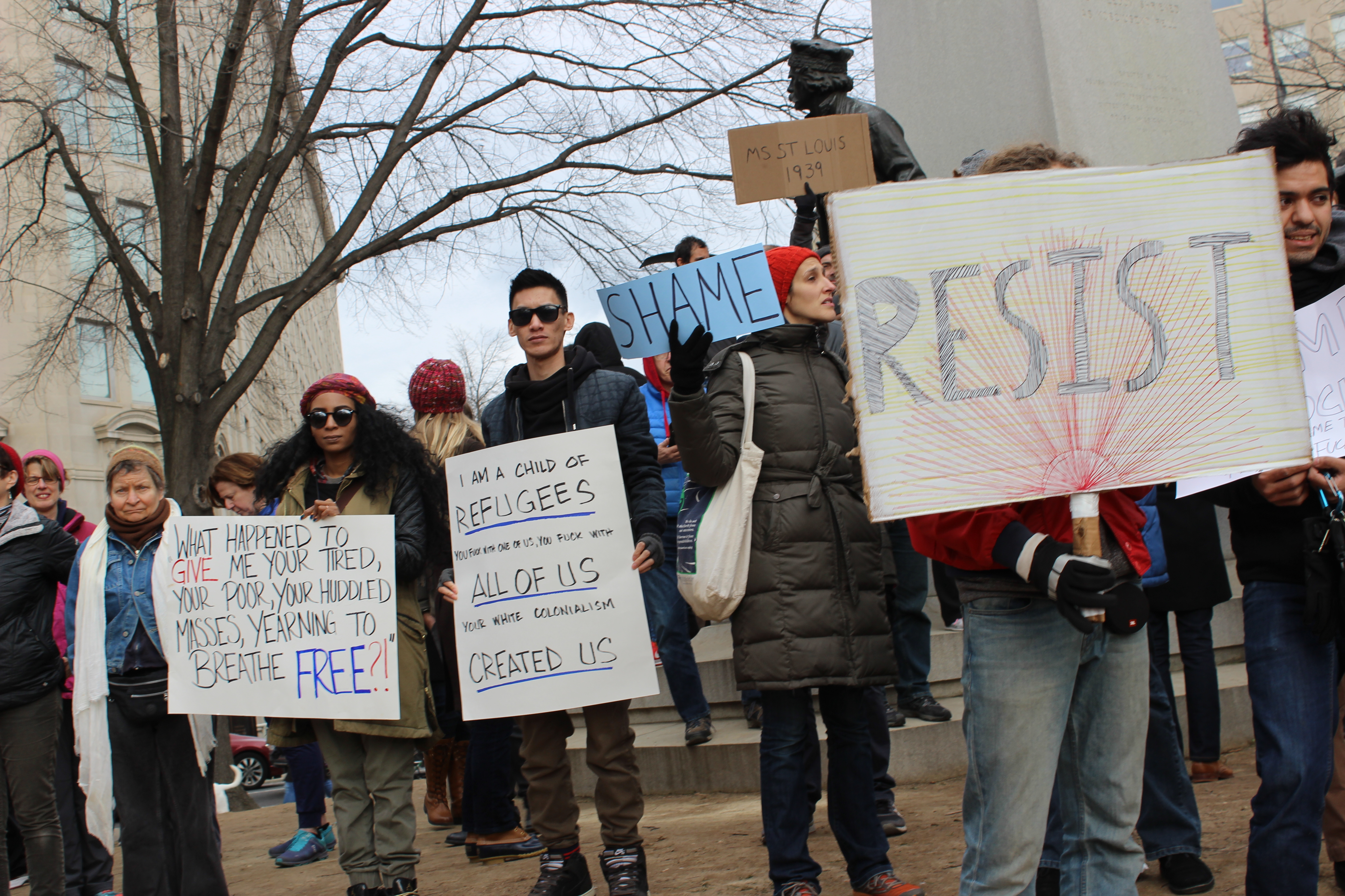 2017년 1월 28일, 수천 명의 시위대가 존 F. 케네디 국제공항에 모여 트럼프의 행정 명령 13769호에 의해 입국이 금지된 국가 출신의 난민과 방문객의 구금에 항의했다.[151] 이 시위로 인해 미국 전역의 공항과 기타 장소에서 수십 건의 추가 시위가 벌어졌다.[152][153]