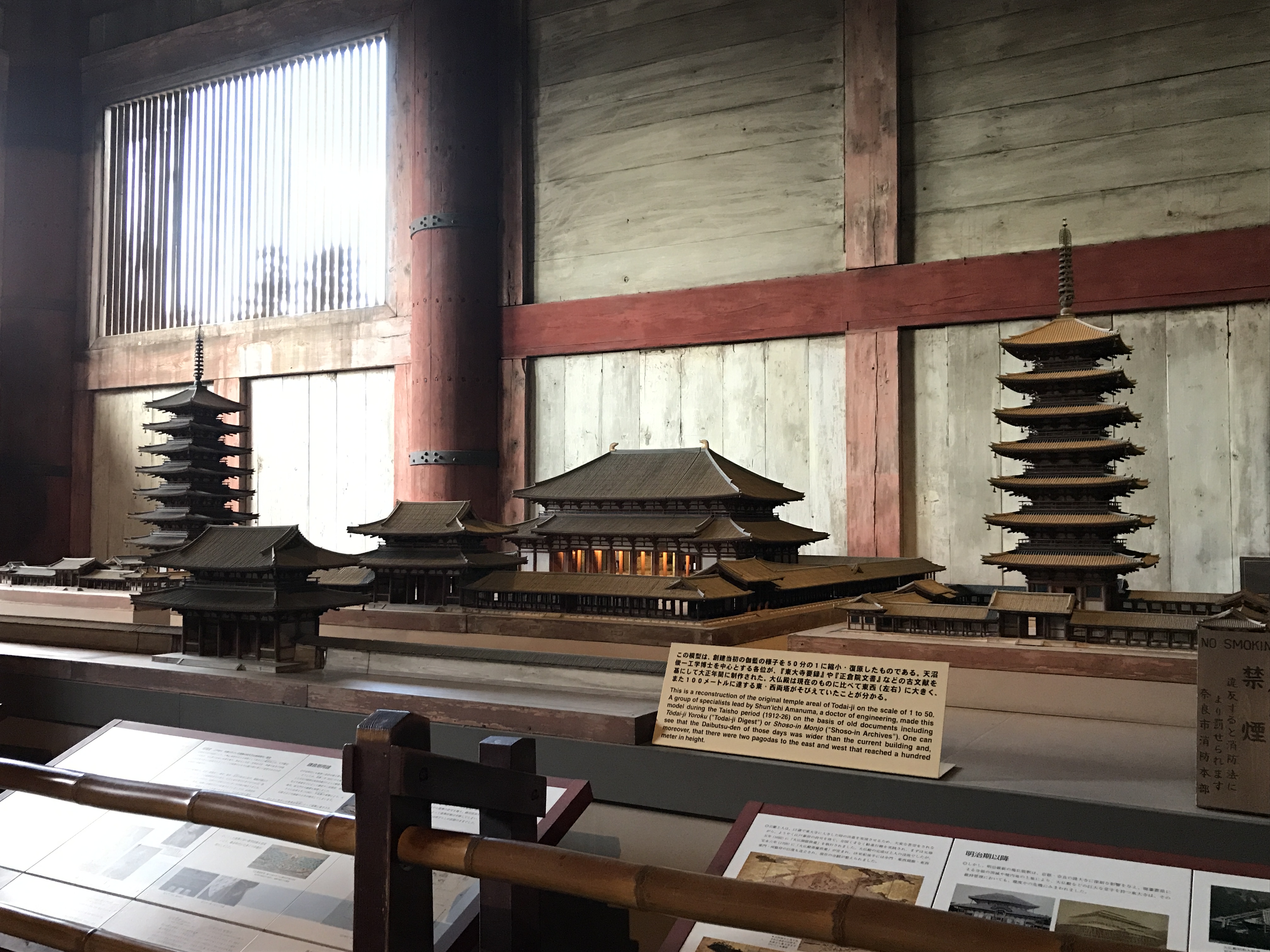 나라 시대 도다이지 가람은 남대문, 중문, 금당(대불전), 강당이 남북 방향으로 일직선으로 나란히 서 있었고, 강당 북쪽에는 동·북·서쪽으로 「コ」자 모양으로 승방(승려들의 거처)이 있었으며, 승방 동쪽에는 식당(직당)이 있었다. 남대문과 중문 사이 좌우에는 동서 2기의 칠중탑이 회랑에 둘러싸여 있었다. 745년 착공하여 가람이 대략 완성될 때까지는 40년 가까운 시간이 걸렸다.