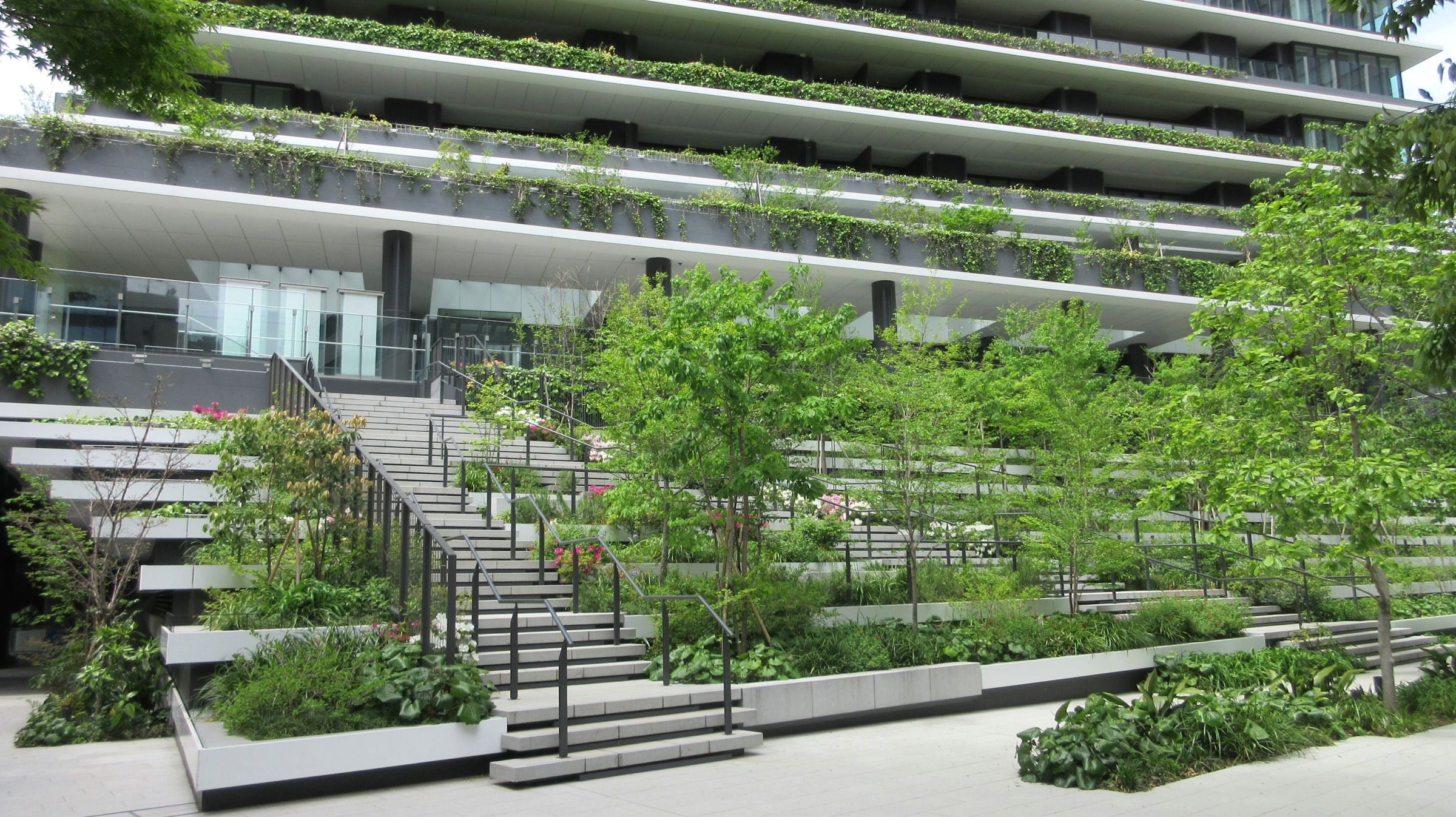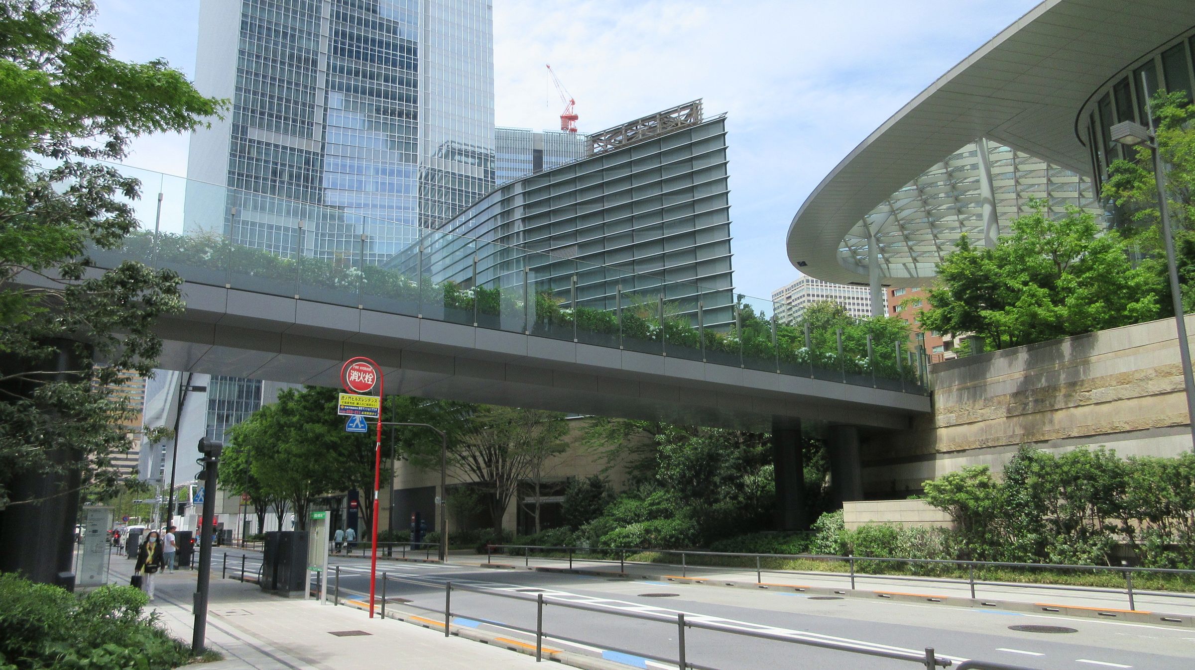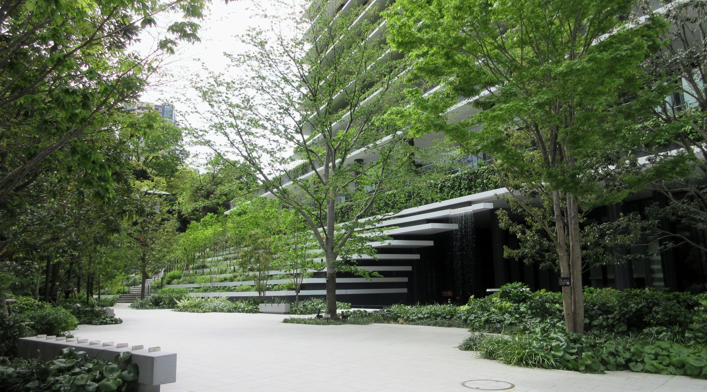 아타고 신사(愛宕神社)와 도라노몬 힐스 모리 타워(虎ノ門ヒルズ森タワー) 사이를 연결하도록 배치된 54층 건물 동쪽 1~3층 부분의 테라스 형태 녹지대가 특징이다. 아타고 신사의 녹지가 해당 건물의 북쪽에 위치한 도라노몬 힐스 모리 타워와 연결되도록 건물 동쪽의 북쪽에서 남쪽까지 튼튼한 녹지 축을 형성하고 있다. 수종은 시라카시(シラカシ)나 아라카시(アラカシ) 등 자연 식생을 기본으로 하며, 정원수나 공원수로 친숙한 계절감이 풍부한 모습을 보여주는 소메이요시노(ソメイヨシノ)나 수국 등도 들여와 사람들을 즐겁게 하고 있다. 4층~8층의 동쪽 처마 상부도 녹화되어 동쪽 전체에 녹지가 펼쳐지는 모습을 볼 수 있다. 아타고 신사에 접하는 남쪽은 동쪽과 서쪽을 잇는 뒷동선과 같은 공간이지만, 기복을 잘 활용하여 매력적인 녹지 노지가 형성되어 있다.[25]