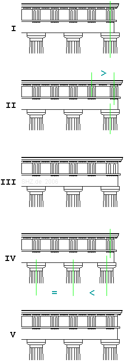 건축은 조화의 규칙을 따랐다. 원래 디자인은 나무 사원에서 유래되었고 삼각판은 나무 들보의 실제 머리였기 때문에 모든 기둥은 기둥 중앙에 놓이는 들보를 지탱해야 했다. 삼각판은 규칙적으로 배열되었고, 마지막 삼각판은 마지막 기둥 위에 중심을 두었다(''위 그림 '''I.'''''). 이것이 이상적인 해결책으로 간주되었다.