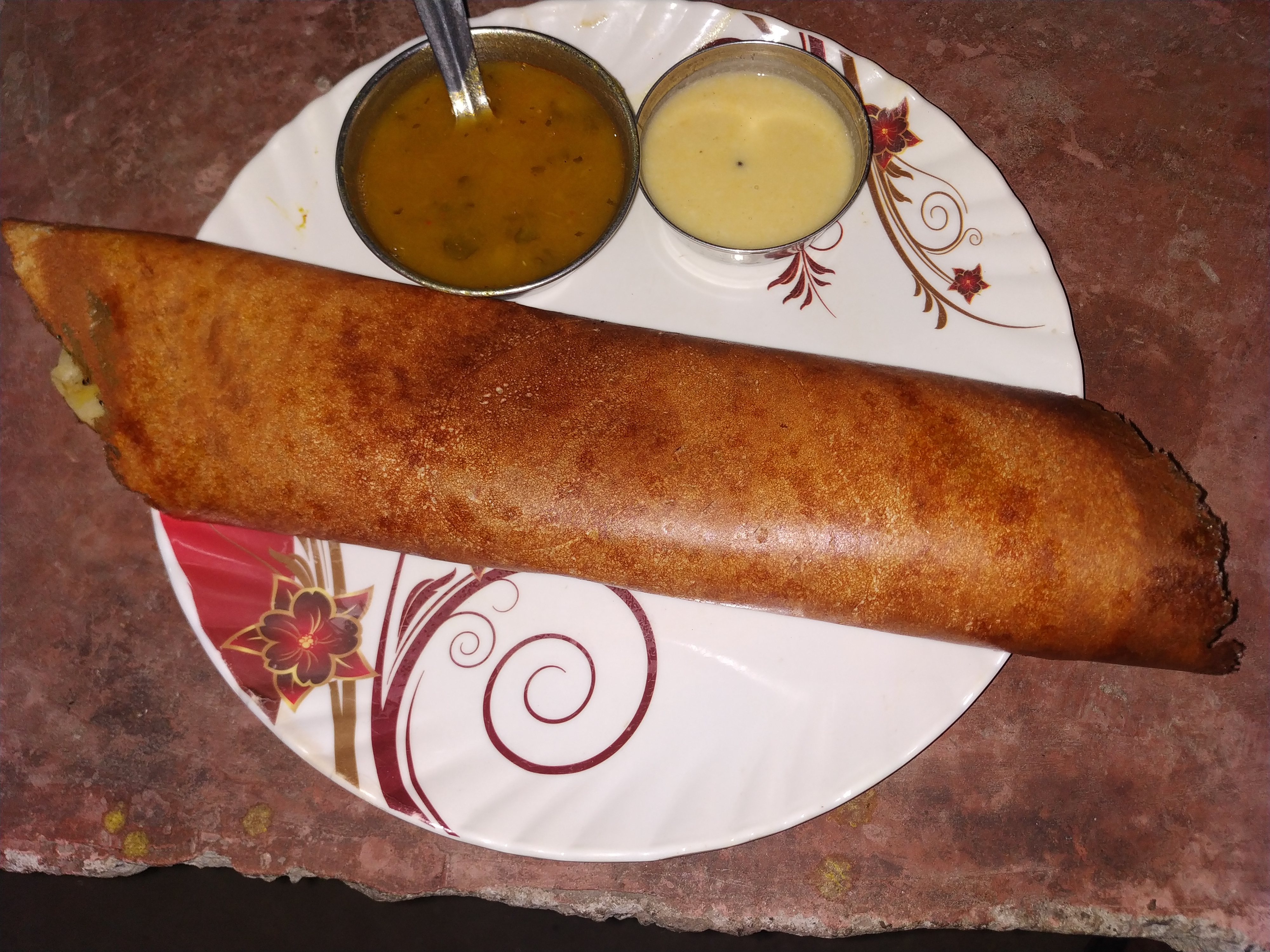 마살라 도사 | 구운 바삭한 도사로, 감자 카레, 처트니, 삼바와 함께 제공된다. |
