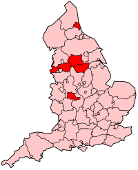- 그레이터 맨체스터: 맨체스터, 솔퍼드, 볼턴, 배리, 올덤, 로치데일, 스톡포트, 테임사이드, 트래퍼드, 위건