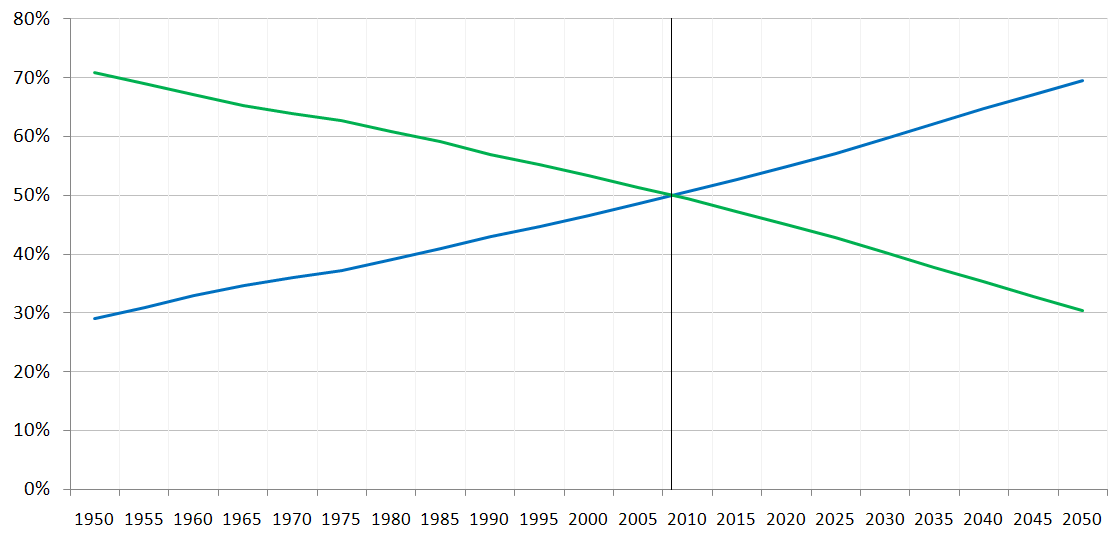 20세기 초, 세계 인구의 15%만이 도시에 거주했다.[16] UN에 따르면, 2007년은 세계 인구의 50% 이상이 도시에 거주하기 시작한 전환점으로, 이는 인류 역사상 처음 있는 일이었다.[15] 2005년판 『국제연합 세계 도시화 전망』(UN World Urbanization Prospects) 보고서에 따르면, 1900년 2억 2천만 명(세계 총인구의 13%)이었던 도시 인구는 1950년 7억 3천 2백만 명(세계 총인구의 29%)으로 증가하였고, 2018년에는 38억 명(세계 인구의 55%)이 도시에 거주하게 되었다.[114] 2030년에는 도시 인구가 세계 인구의 60%(49억 명)에 이를 것으로 예측된다.[115]